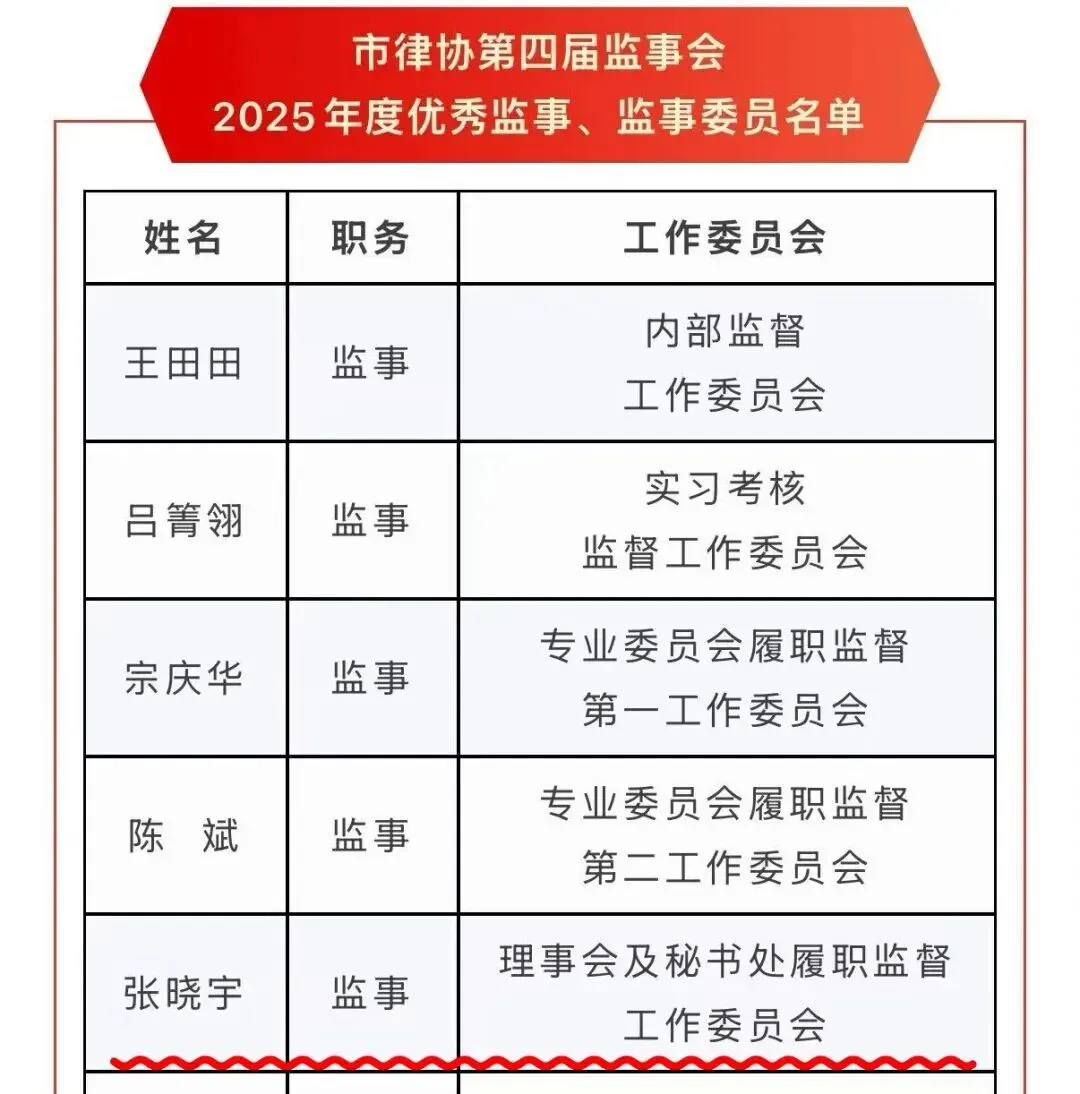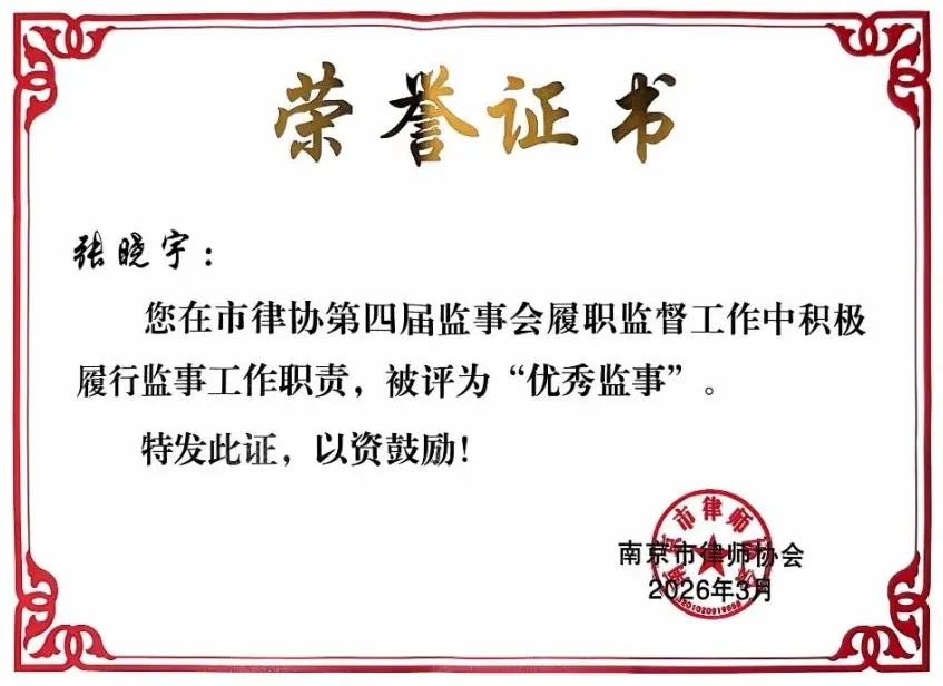 耀时律师事务所创始人、主任合伙人张晓宇律师获评南京市律师协会第四届监事会“优秀监事”。