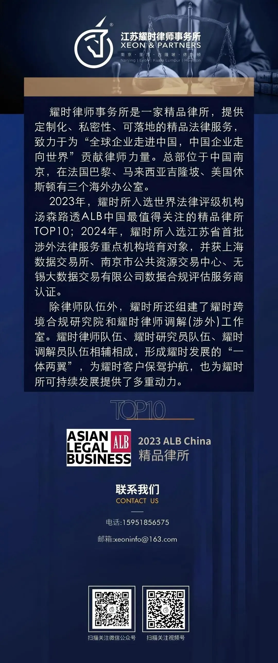 耀时律师事务所是一家提供涉外法律服务的精品律所,总部位于中国南京,在马来西亚吉隆坡、法国里昂和美国休斯顿设立三个海外办公室,并与香港、澳大利亚、阿联酋、印度、新加坡等地律师事务所建立了广泛合作关系,为中国企业提供单一接口、一站式法律服务。我们的服务特点是“定制化、私密性、可落地”,我们优先考虑客户的利益,确保在整个法律过程中保持最高水平的保密性、专业性和奉献精神。