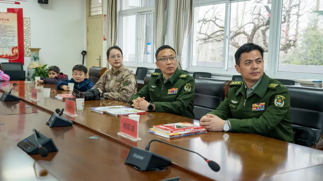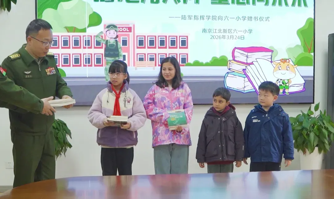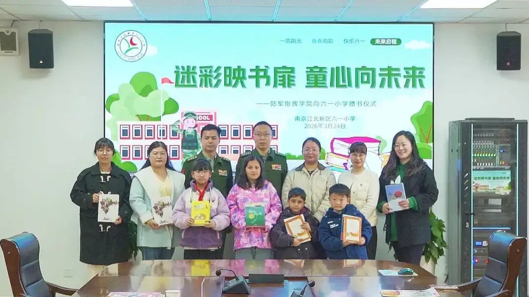3月24日上午,陆军指挥学院政治工作处领导一行莅临南京江北新区六一小学,开展了一场意义深远的图书捐赠与交流活动。此次活动以“迷彩映书扉 童心向未来”为主题,既是教联体框架下军地共建的生动实践,也为学校“15分钟教育圈”注入了鲜活的育人资源,为校园增添了浓厚的崇军尚学氛围。