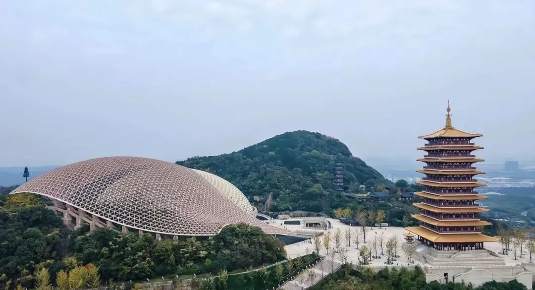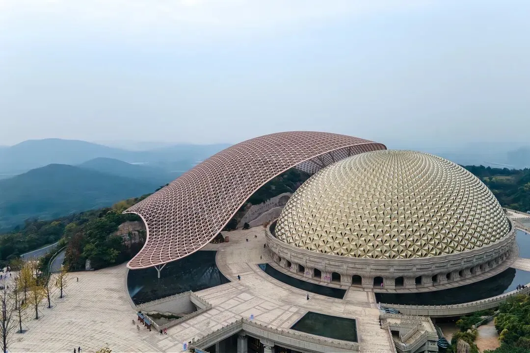 从外面看,佛顶宫并没有传统寺庙的飞檐翘角,而是一个巨大的、流线型的半圆形建筑,覆盖在小牛首山上。它表面是银色的钛合金板和黄铜格栅,远远看去,既像一朵半开的莲花,又像极了一个科幻电影里迫降地球的巨大UFO。