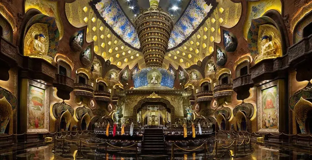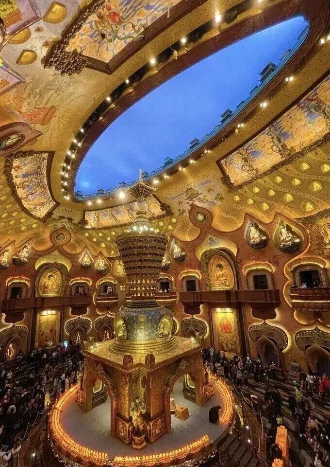 当电梯门打开,你一定会倒吸一口凉气。映入眼帘的是一个深达几十米的巨大穹顶空间,四周的墙壁上布满了精美的木雕和壁画,金色的线条从穹顶中心像水波一样向四周扩散。整个空间被暖黄色的灯光笼罩,空气中似乎都弥漫着淡淡的檀香。你走在里面,会觉得自己的声音都被这宏大的空间吞噬了,一种莫名的敬畏感油然而生。