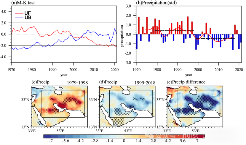 降水是影响西亚干旱变化的主要因素,对当地生态与气候变化至关重要。西亚地处干旱/半干旱气候区,干旱区域的扩张不仅会加剧区域变暖,还会进一步加剧西亚的陆面热力异常。值得注意的是,西亚陆面热力异常不仅会改变海陆热力对比,影响印度洋的水汽输送及印度夏季风,更对下游东亚地区的气候具有显著的调控作用。因此,全面了解西亚降水的变化特征及其背后的物理机制,对于预测区域陆面热力异常及下游气候演变具有重要的意义。虽然作为连接地中海和印度洋的桥梁,但西亚大部分地区由于不受印度夏季风的直接影响,导致其降水主要集中在冷季(12月至次年3月)。近年来,在全球变暖背景下,西亚表现出显著的增温趋势和对气候变化的高敏感性。以往的研究多集中于天气尺度、季节内及年际尺度上西亚冷季降水的变化及影响因子。然而,了解降水的年代际变化对于长期的旱涝气候预测同样关键。NUIST陆气相互作用团队朱司光副教授指导的硕士研究生何嘉榕,及合作者陈海山教授等,基于长时间序列观测资料、再分析数据以及地球系统模式(CESM2)模式试验,深入探讨了西亚冷季降水(WACP)在1990年代末年代际减少的物理机制,揭示了大西洋多年代际振荡(AMO)和北极海冰的驱动作用。相关成果近期发表在国际期刊《Climate Dynamics》上。主要结论如下:基于M-K突变检验和低通滤波分析,研究发现西亚冷季降水(20°N-40°N, 40°E-70°E)在1990年代末(1998年左右)发生了一次显著的年代际突变,由偏多期转为偏少期(图1)。这种降水的年代际减少与同期大气环流背景的显著调整密切相关。在降水偏少的时期(1999-2018年),对流层上层的中东急流(MEJS)发生显著北抬。这种北抬阻碍了冷涡南下引发强对流天气,使得西亚上空对流层高层被异常反气旋控制;同时,对流层低层同样受到异常高压和反气旋环流的支配。这种“高低空一致”的配置导致西亚地区出现显著的下沉运动。此外,来自阿拉伯海的水汽输送也随之减弱,使得西亚地区难以维持充足的水汽条件,进而导致降水异常偏少。