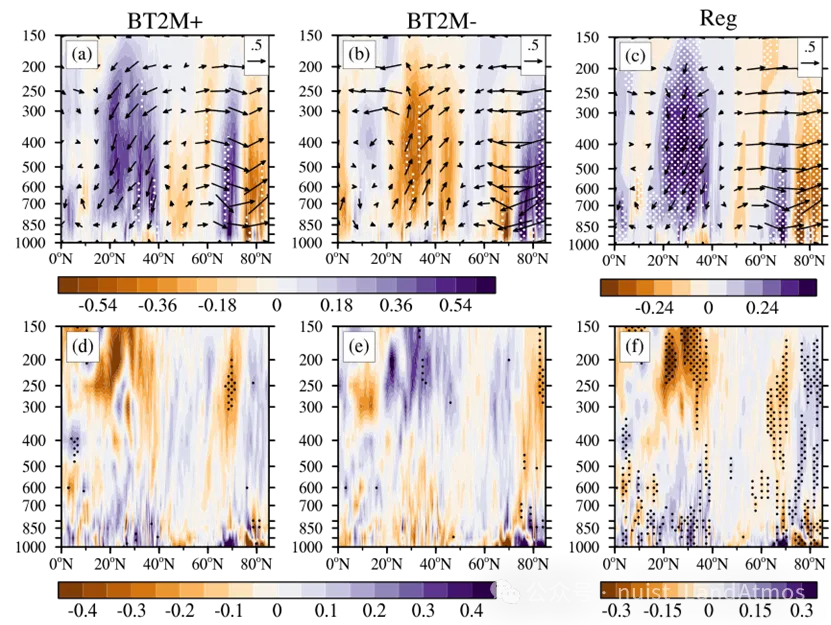 图2. BSIC异常偏少(暖期)与偏多(冷期)对应的经向环流异常。BT2M暖位相和BT2M冷位相时期30°E-70°E纬向平均的(a, b) 垂直速度 (;填色;10-2Pa·s-1) 与经向风 (矢量;m·s-1) 异常剖面;和(d, e) 水平风散度 (10-6S-1)异常剖面。以及对 (c, f) BT2M指数的回归。打点表示显著性水平在95%以上的区域。