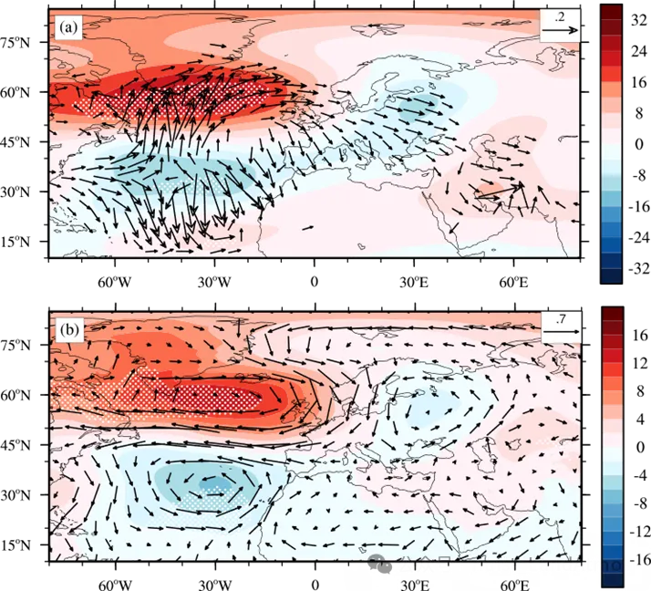 图3. AMO回归的 (a) 300 hPa位势高度 (填色; gpm) 及波作用通量 (WAF; 矢量; m-2·s-2)与 (b) 850 hPa位势高度 (填色; gpm) 及水平风场 (矢量;m·s-1) 。打点表示显著性水平在95%以上的区域。