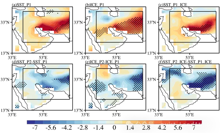为了剥离并验证AMO和巴伦支海海冰各自的具体作用,本文利用地球系统模式(CESM2)设计了6组敏感性试验。结果显示:单独施加AMO暖位相海温,或单独施加巴伦支海海冰偏少的外强迫,均会导致西亚地区水汽输送路径的改变和降水的抑制(图4)。