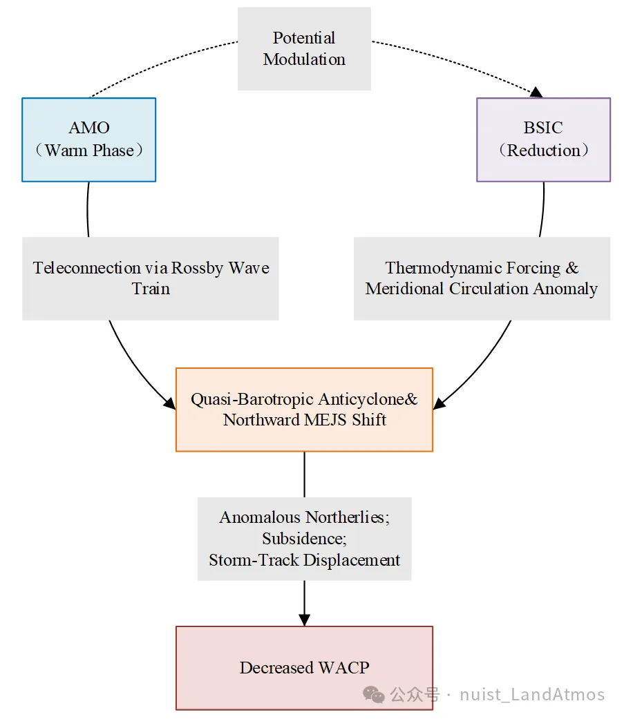 除了极地海冰的驱动,来自北大西洋的年代际信号同样关键。回归分析和波作用通量(WAF)诊断显示,当AMO处于暖位相(正位相)时,北大西洋的异常偏暖海温会在对流层高层激发异常散度,从而触发一支横跨欧亚大陆的大尺度准正压Rossby波列(图3)。该波列从北大西洋中部起始,向北穿越欧洲,最终向东传播至下游的西亚地区。随着波能量的频散,西亚上空形成了显著的正位势高度异常和反气旋环流,伴随着中层强烈的下沉运动。此外,AMO引起的温度梯度改变也促使了MEJS的异常北移,进一步阻碍了降水的形成。