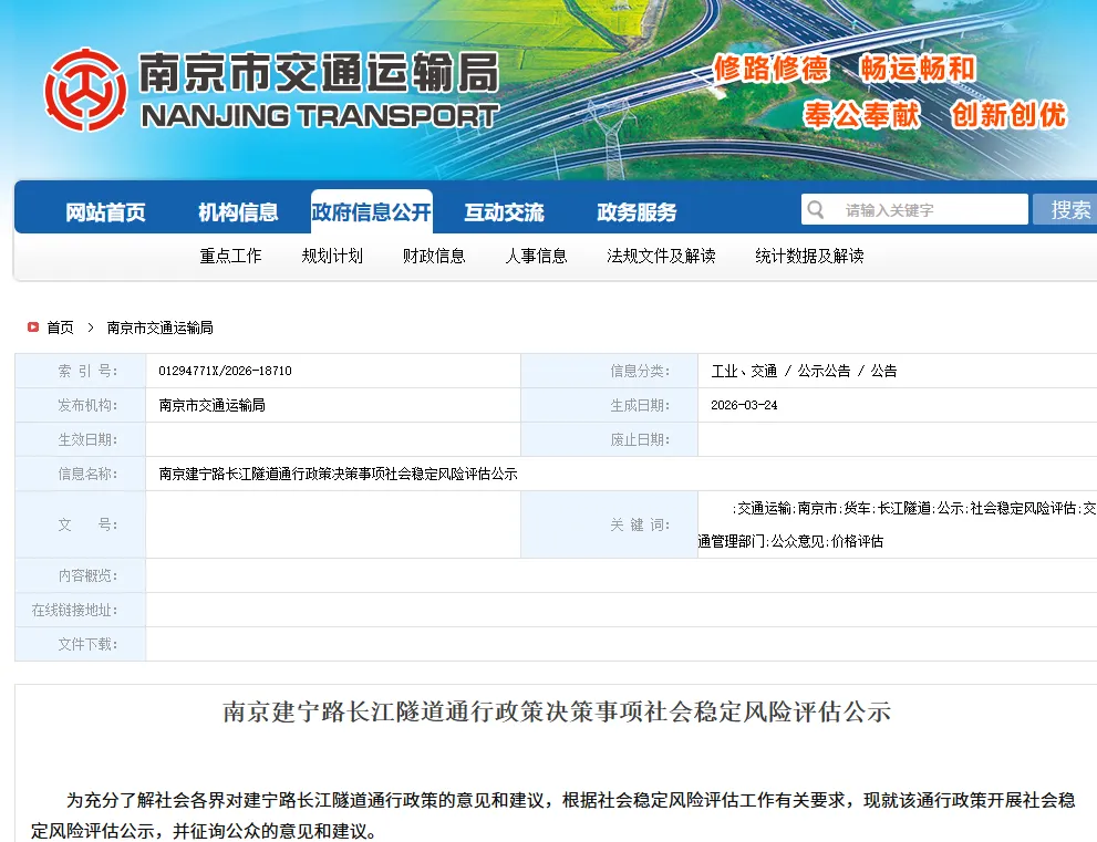 3月24日,南京市交通运输局发布关于《南京建宁路长江隧道通行政策决策事项社会稳定风险评估公示》。