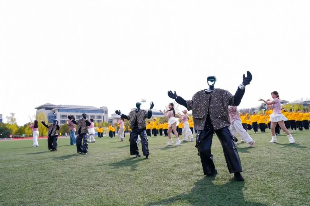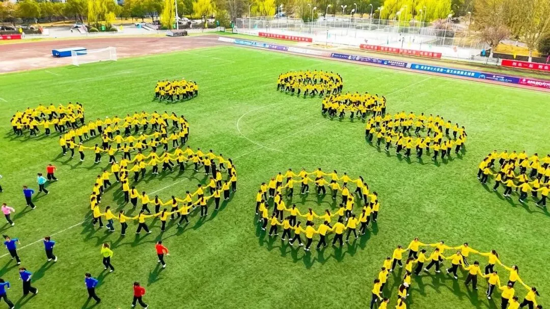 方阵退场后,在体育教学部刘维烨、毕茜眉老师的指导下,各学院学子带来一场充满活力的团体操表演——快乐小马映在黄色的汪洋,动作整齐划一。