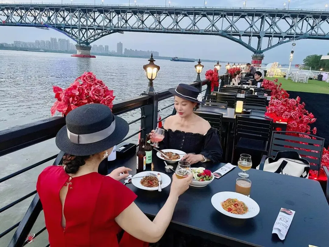 我们戴着礼帽,碰杯时杯沿轻响,红玫瑰在桌中央热烈盛放,身后是横跨长江的大桥,像一幅流动的油画。
