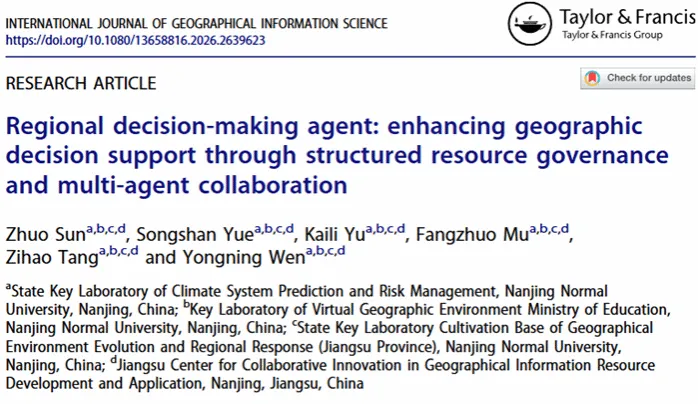 引用格式:Sun, Z., Yue, S., Yu, K., Mu, F., Tang, Z., & Wen, Y. (2026). Regional decision-making agent: enhancing geographic decision support through structured resource governance and multi-agent collaboration. International Journal of Geographical Information Science, 1-27. https://doi.org/10.1080/13658816.2026.2639623
