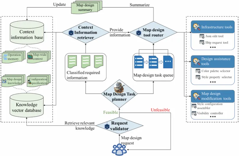 该研究提出了MapMate框架,旨在通过大语言模型(LLM)实现基于自然语言交互的地图设计。地图设计是地理信息表达与应用的基础性任务,但其涉及复杂操作流程、专业门槛较高,制约了广大普通用户的使用。MapMate通过构建层次化地图设计知识库与平台规范,弥合了自然语言修改意图与专业地图配置参数之间的鸿沟。针对多轮交互中大语言模型的记忆局限,研究设计了操作历史与全图设计状态的上下文持久化策略。通过单图层精修、跨图层协同设计及上下文感知地图多图层设计三个案例验证,MapMate有效降低了地图设计的技术壁垒,为构建智能、易用的AI增强型GIS应用提供了制图模块智能化的新思路。