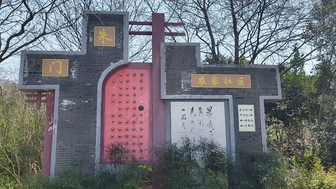 快到土菜馆看到村口朱门农家社区的标志牌,相传朱元璋时期官员将这里门户漆朱红迎驾,得名“朱门”,有“中华门外七十镇,当属朱门第一镇”之说,是南京十大美丽乡村、江苏三星级乡村旅游点。