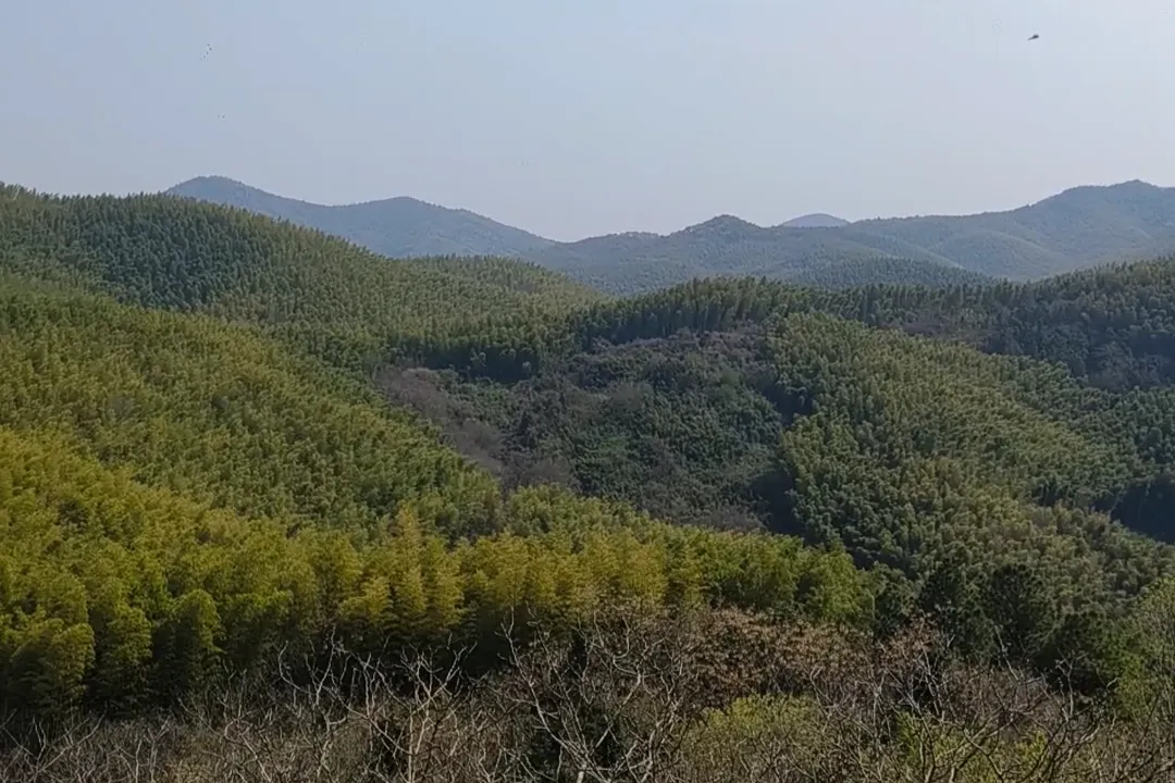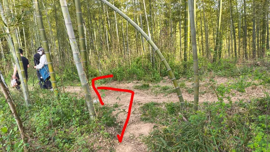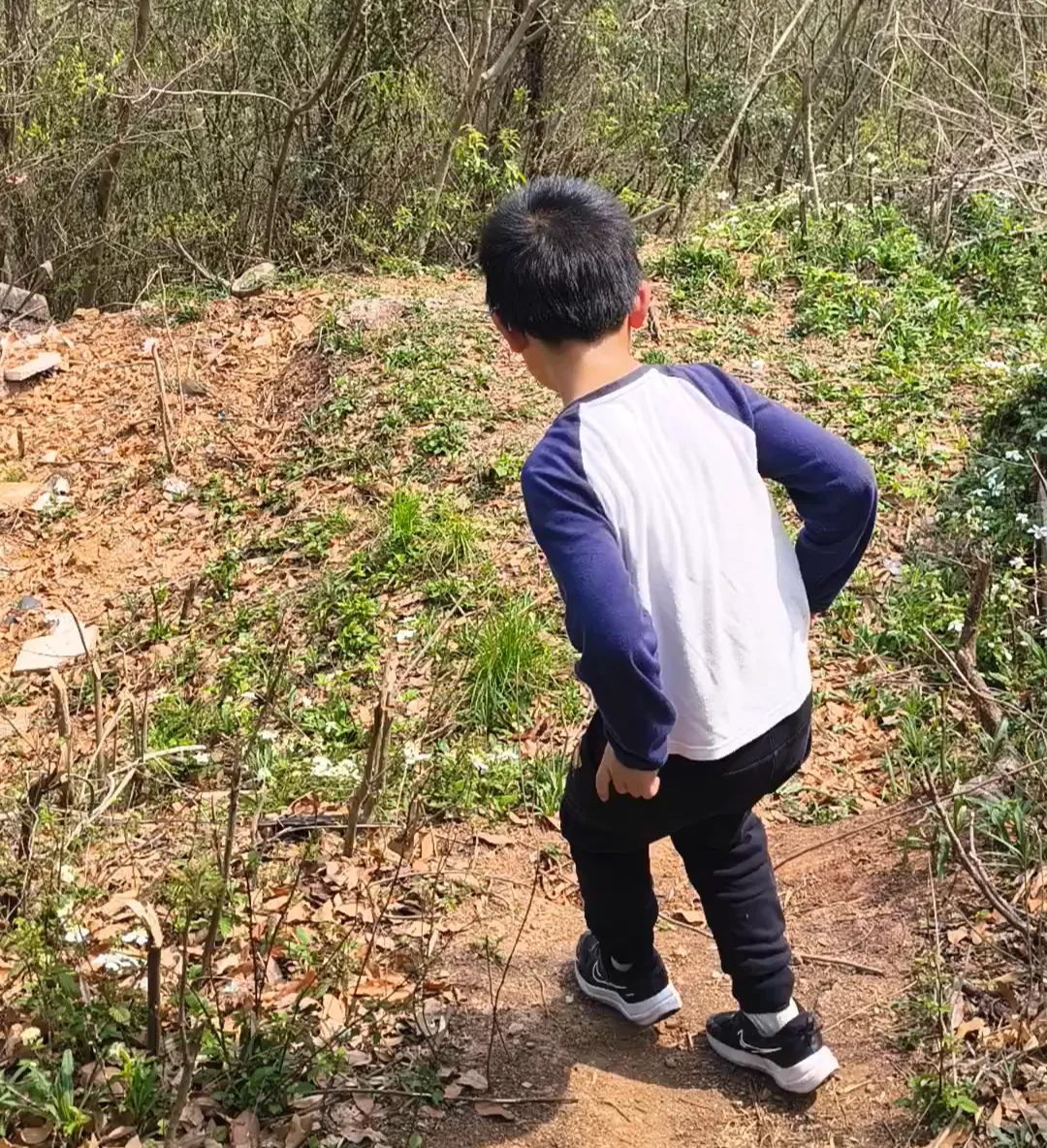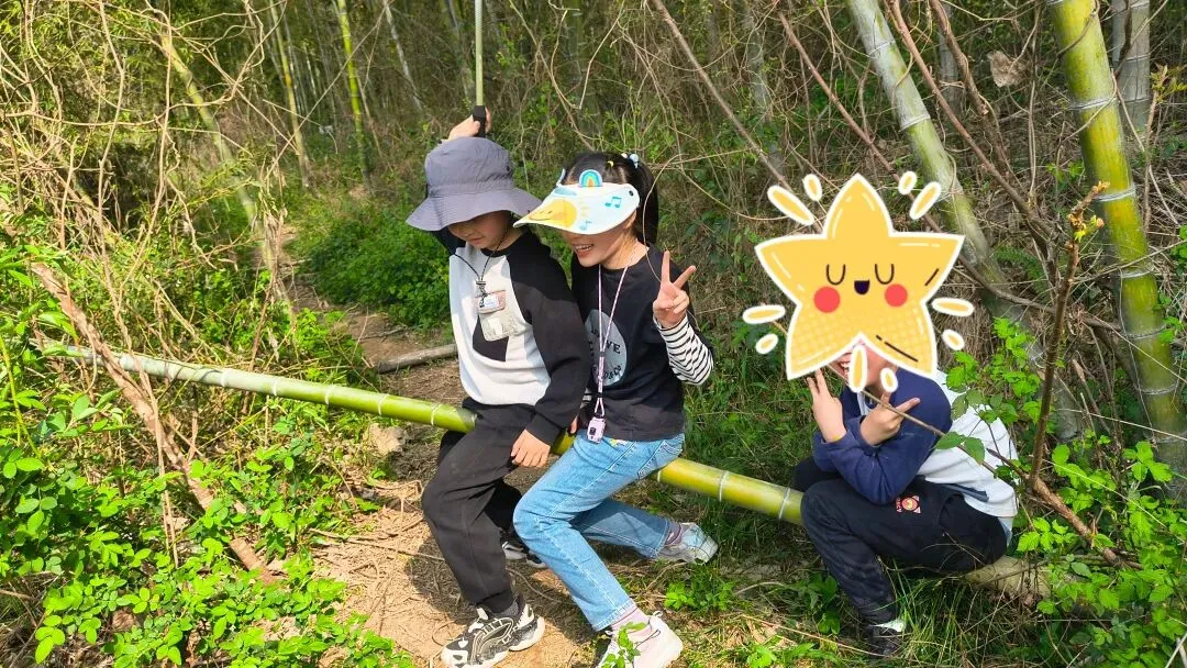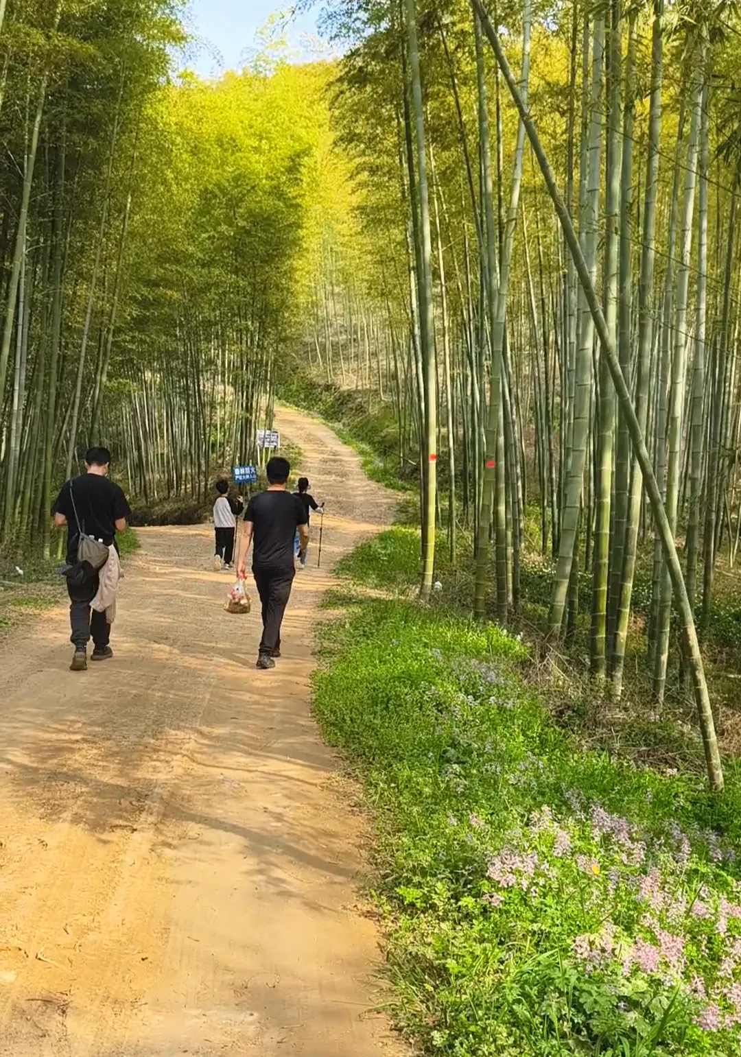 大约慢悠悠步行七八分钟,上了一个较大的坡道后,到了分岔口,这里有健康步道终点的标志,这个位置向左前或者向右后都可以走,是小环线顺时针和逆时针两个方向,我们这次选择的向右后方前进。沿着右后方这条路步行不多远,就可以看到路边有个亭子,古风古韵的,还挺好看的。这个亭子旁边有一条台阶路,应该是从下方还有一条台阶路能上来。亭子往前左边有一条上山的台阶路,两侧都是竹子,从地图上看应该是通往朱门状元阁(也叫宁郎阁)。虽然这个路线和我们参考的两步路路线不一致了,但是我们还是决定去状元阁一探究竟,于是我们在竹林间拾级而上。这就是宁郎阁啦,又称朱门状元阁,这并不是古迹,而是2014年修建而成的,如今却也是成了直山一景。亭内有一楼梯,扶手已晃动,看来建好后并没有很好维护。登上亭已俯瞰连绵起伏的丘陵山脉和一望无际的竹海,视野开阔,风景秀丽。这个亭子也就是直山的最高点了,整体来说还是非常轻松的,当然我们的徒步并没有结束。在亭子的东南方向有一条下山的小路,算是野道吧,浮土和枯竹叶较多,要小心点下山。野道上也有路标,但不多,好在行走的痕迹还算清晰,小朋友还自己总结了防滑技巧:横着走。走到一半的时候,我们忽然听到竹林里面传来人声,仔细一看,竟然是别人在挖竹笋。于是我们也临时决定进入竹林探险,看看能不能找到竹笋。可不就是找到了吗,小朋友们兴奋极了,虽然我们没带工具,但是还是凭借着毅力、登山杖和竹林里面捡的木棍一点一点挖了出来。收获,发现挖竹笋并不容易,非常考验眼力,几个小朋友都用他们的细心发现了冒尖尖的竹笋了,真的很开心啊!在这片竹林里面欢快挖笋大约1小时后,我们终于从这片竹林出来,出来后是一个三岔口,向左继续小环线,向右返程回到出发点,我们选择向左继续小环线。这条路起初还是宽敞的大路,没走多远路面就渐渐变窄,路边也开始杂草丛生。想来大概是来游玩的人大多在竹林里挖完笋就直接返程了,很少有人继续往前走,这条路才显得有些冷清?这样的小路大概走了10分钟,遇到一个三岔路口,左转继续,这里可以看到一个00038小班4号标准地,不知道是哪个幼儿园在这里承包了一片竹林?继续向前走两三分钟分钟会再遇到一个十字路口,选择向左转。这边也是大路,路两边都是毛竹,以及这种粉紫色的小花。走了三四分钟,遇到Y字路口,右边是全程七八公里的大环线,今天时间有限,我们选择从左边走。从这里开始一直沿着大路走,大约10分钟,会看到几间红砖房子。左转后马上会遇到一个门口有小池塘的养殖场,走左边继续向前。过了养殖场,走到大路转弯的地方,这里要注意,不能继续沿大路走了,要从右边走。走到这里手机就没电了,后面没能再拍照记录,好在也快回到起点,我用文字把剩余路线说清楚,照着走就没问题。