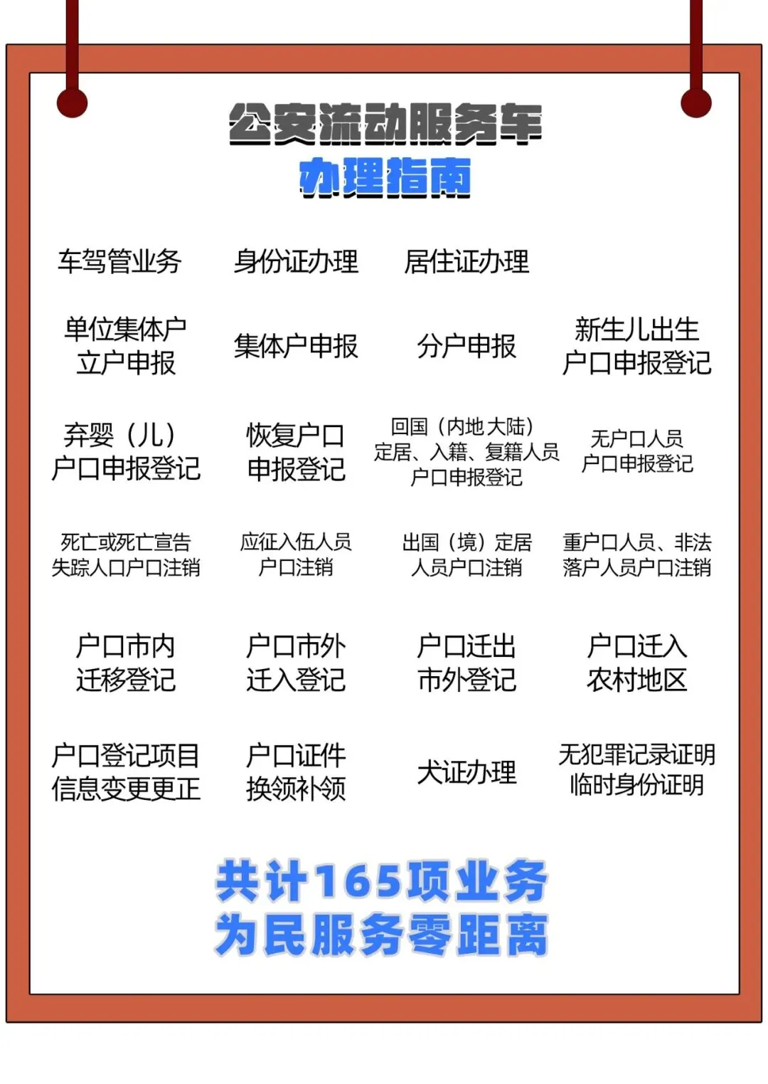 ● 在原有车驾管业务的基础上,增加了身份证业务5项、居住证业务5项、户籍业务136项、犬证业务2项、证明业务2项,共计165项公安业务的受理办理。