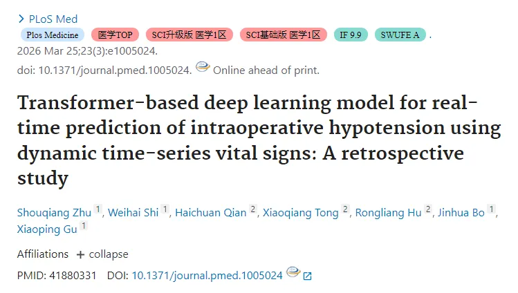 中文标题:基于Transformer的深度学习模型用于利用动态时间序列生命体征实时预测术中低血压:一项回顾性研究