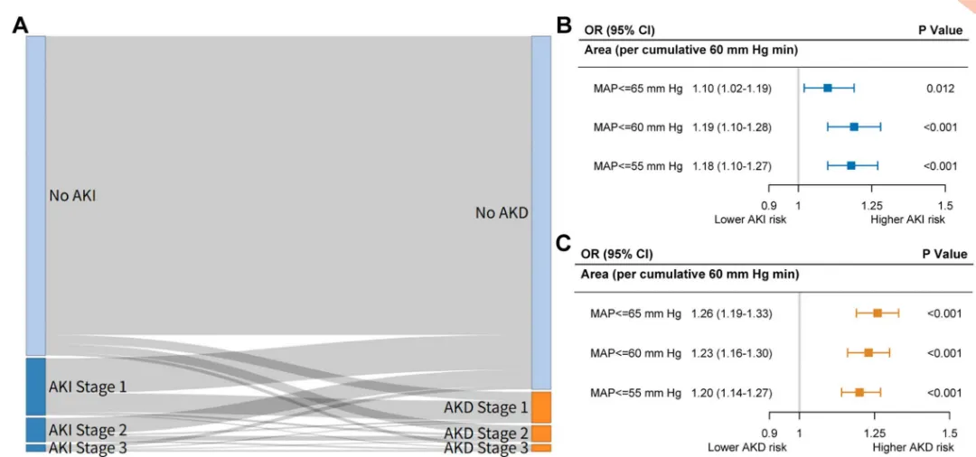 在23075名患者中,累积性术中低血压与术后急性肾损伤(AKI)和急性肾脏病(AKD)风险增加显著相关,且低血压暴露越严重,肾损伤风险越高。研究发现,AKI患者有相当比例进展为AKD,凸显了肾脏损伤在术后期的连续性(图2)。