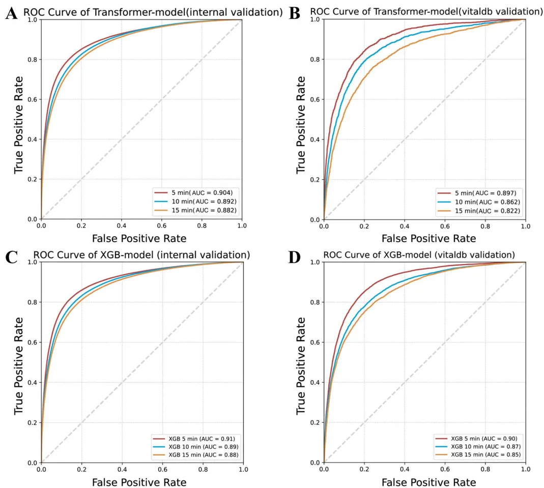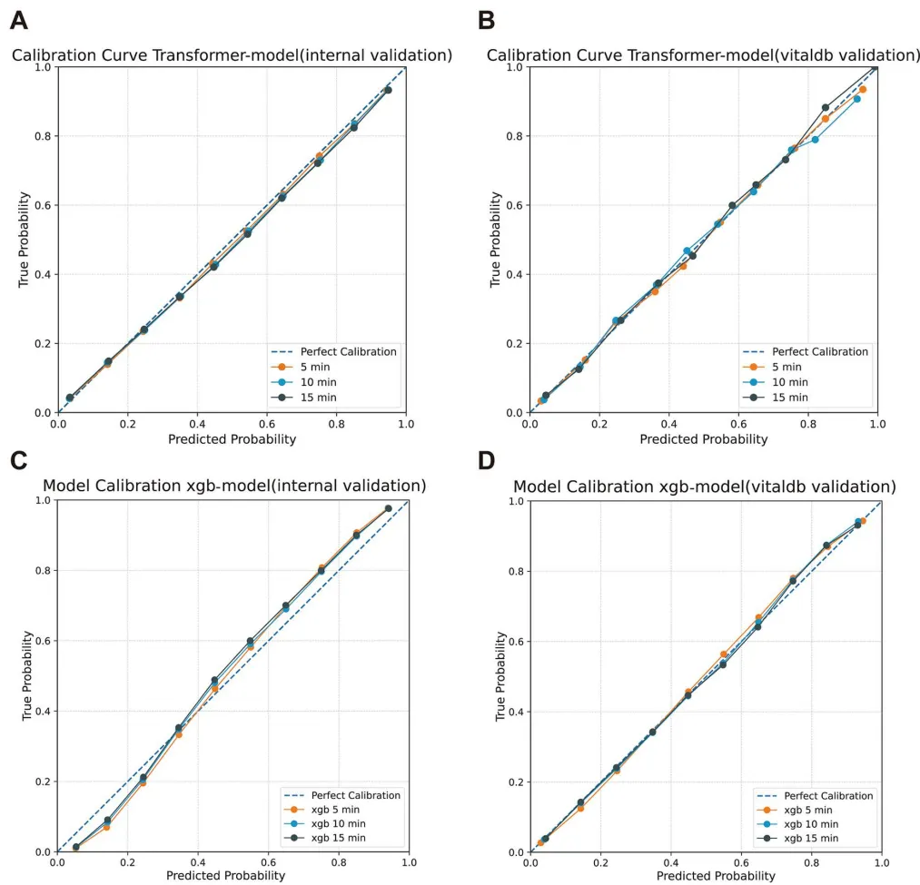 基于Transformer的模型在预测术中心动过缓时展现出极高的灵敏度,能有效避免事件漏报,而XGBoost模型则凭借更高的准确率与特异性,有助于减少误报警。两者性能形成互补,前者优势在于召回率与概率校准,后者强在总体判别与保守预警(图3、图4)。