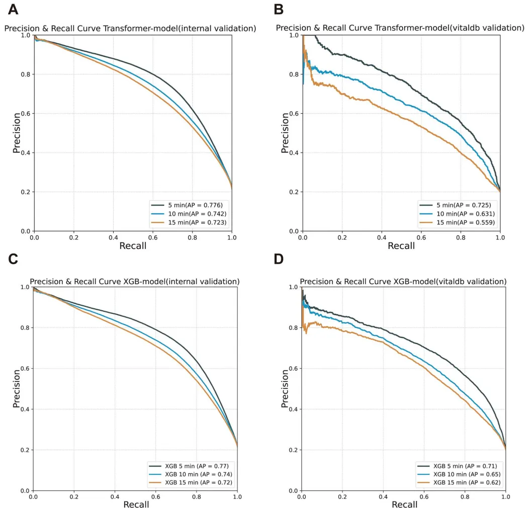图4.用于术中低血压预测的基于Transformer和XGB模型的PR曲线比较