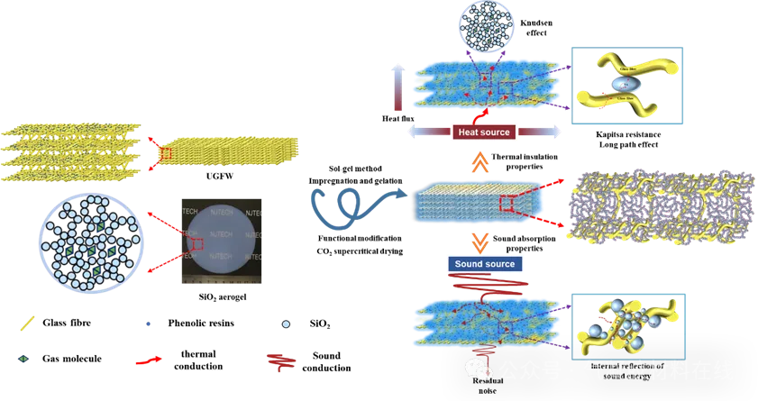 随着世界经济的快速增长和人口的增加,全球能源消耗不断增加。根据《2018年国际能源展望》(IEO2018),全球能源需求预计将从 2020 年的 1.78×1011 兆瓦时增至 2030 年的 1.78×1012 兆瓦时。其次,化石燃料的燃烧会导致大量二氧化碳排放。特别是在发达国家,仅建筑行业就占二氧化碳和能源排放总量的近 40%。针对这些问题,许多国家的政府都出台了相关政策,通过应用建筑围护结构来最大限度地减少热量损失。研究人员认为,通过开发高效保温材料来节约能源已成为节能减排的重要手段。其中,气凝胶保温材料在业内受到广泛关注。然而目前各向同性隔热材料的发展已进入瓶颈期。在优化机械性能的同时,气凝胶本身的导热性和复合材料的密度将不可避免地增加。在这种情况下,急于提高绝热性能势必会影响力学性能,增加制备过程的繁琐程度,大大增加性能不稳定的概率。将绝缘材料的各向同性结构制备成各向异性结构,有望使材料在保证性能稳定的同时降低导热系数。基于此,南京工业大学崔升教授团队以具有层状结构的超轻玻璃纤维棉毡(UGFW)为模板,复合并嵌入二氧化硅气凝胶(SA),用功能硅烷对网络结构进行了增强,并通过超临界干燥获得了各向异性结构材料。SA@UGFW 不仅具有超轻(58 kg/m3)和高强度(0.1 MPa)的特性,还具有高效的自清洁能力(水接触角≈ 152.4°)。三明治结构气凝胶材料具有超高效的隔热性能(0.015-0.017 W/(m·K))和降噪性能(αmax = 0.93,NRC = 0.51,9.77 mm)。尽管样品厚度仅为 9.77 毫米,但当热源温度为 200 ℃ 时,SA@UGFW 的冷表面温度为 54.2 ℃,ΔT 为 145.8 ℃。此时,ΔT 高于热源温度的 70%。模拟结果表明,与传统保温材料相比,气凝胶建筑保温材料可节约31.00%的采暖能耗和27.34%的制冷能耗。因此,本文报道的具有三明治结构的气凝胶材料实现了室内舒适度的提升,有望在建筑领域得到广泛应用。相关研究成果以“Self-cleaning,