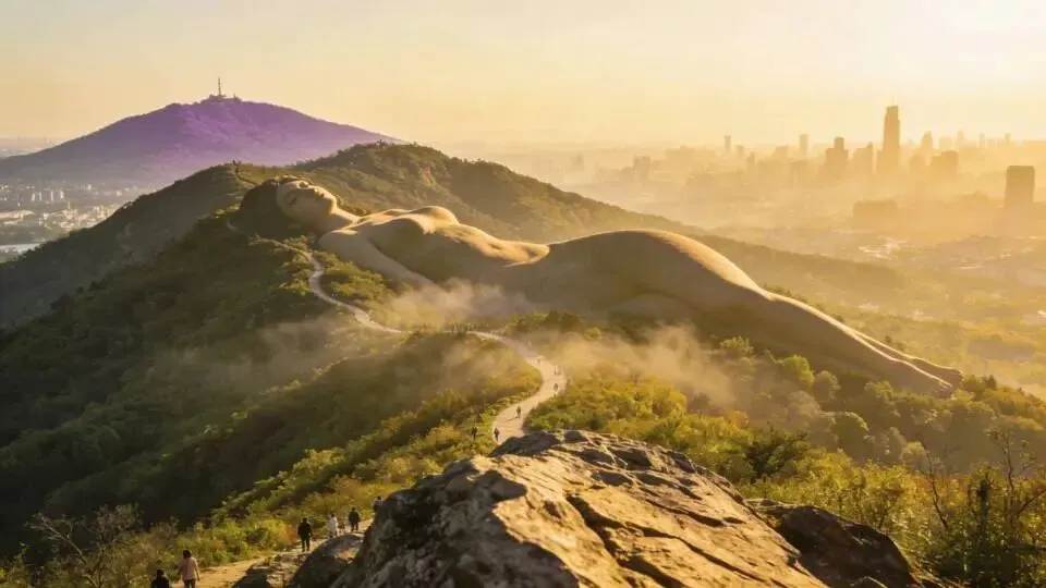 南京的山,向来与历史共生,与烟火相融,这座睡美人山亦是如此。它依偎着南京的灵秀水土,周边林木葱郁,四季流转间,景致各有风情。春日里,山间野花次第绽放,粉白、嫩黄、淡紫点缀在青绿之间,像是给睡美人披上了一袭五彩霓裳,微风拂过,花香弥漫,连沉睡的山峦都似带着春日的温柔;夏日,浓荫蔽日,草木繁茂,翠绿的枝叶层层叠叠,将山峦裹得清凉静谧,蝉鸣鸟语成了最轻柔的摇篮曲,让这份沉睡更显安宁;秋日,层林尽染,枫叶红、银杏黄、松柏翠交织,色彩斑斓,宛如美人换上了华贵的秋装,在暖阳下美得醇厚;冬日,若遇落雪,白雪覆满山脊,银装素裹,山形愈发清晰柔和,好似美人裹着洁白的绒毯,纯净又圣洁,尽显清冷雅致的金陵冬韵。