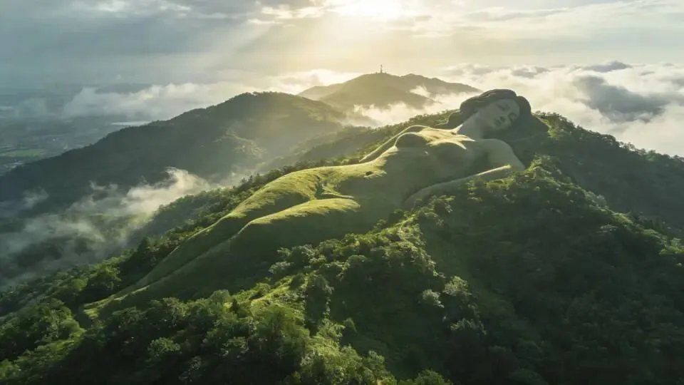 激战三天三夜,凤凰仙子以仙力镇压旱魔,耗尽修为,再也无力飞回天界。她缓缓仰卧在地,身躯化作连绵山峦——头枕清风,青丝凝为林间草木,肩头覆满青苍,胸腹起伏如呼吸,四肢舒展向远方,整座山便如一位温婉佳人,在天地间安然沉睡。