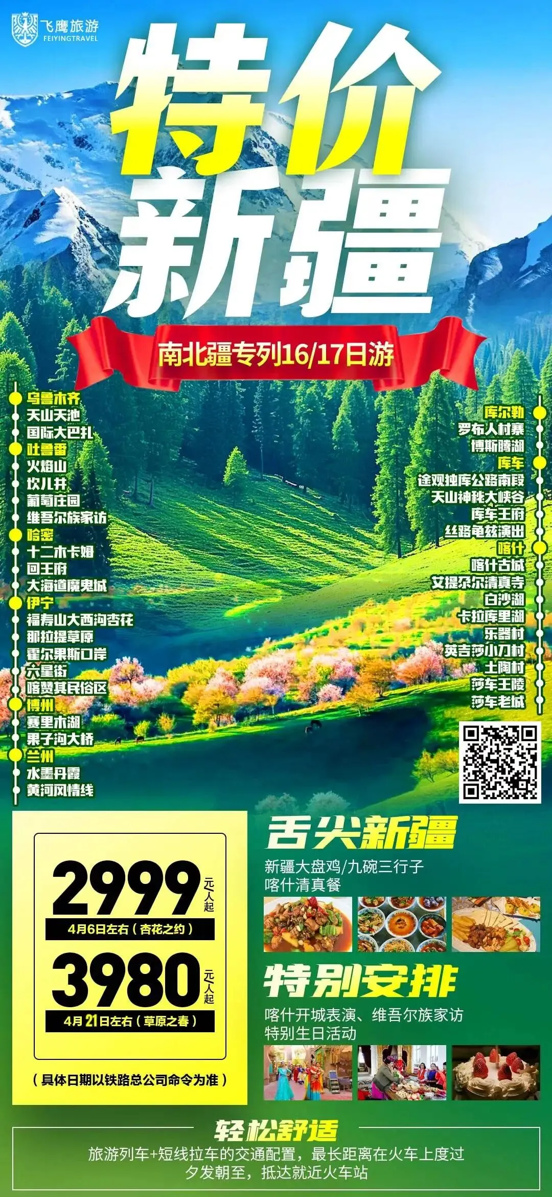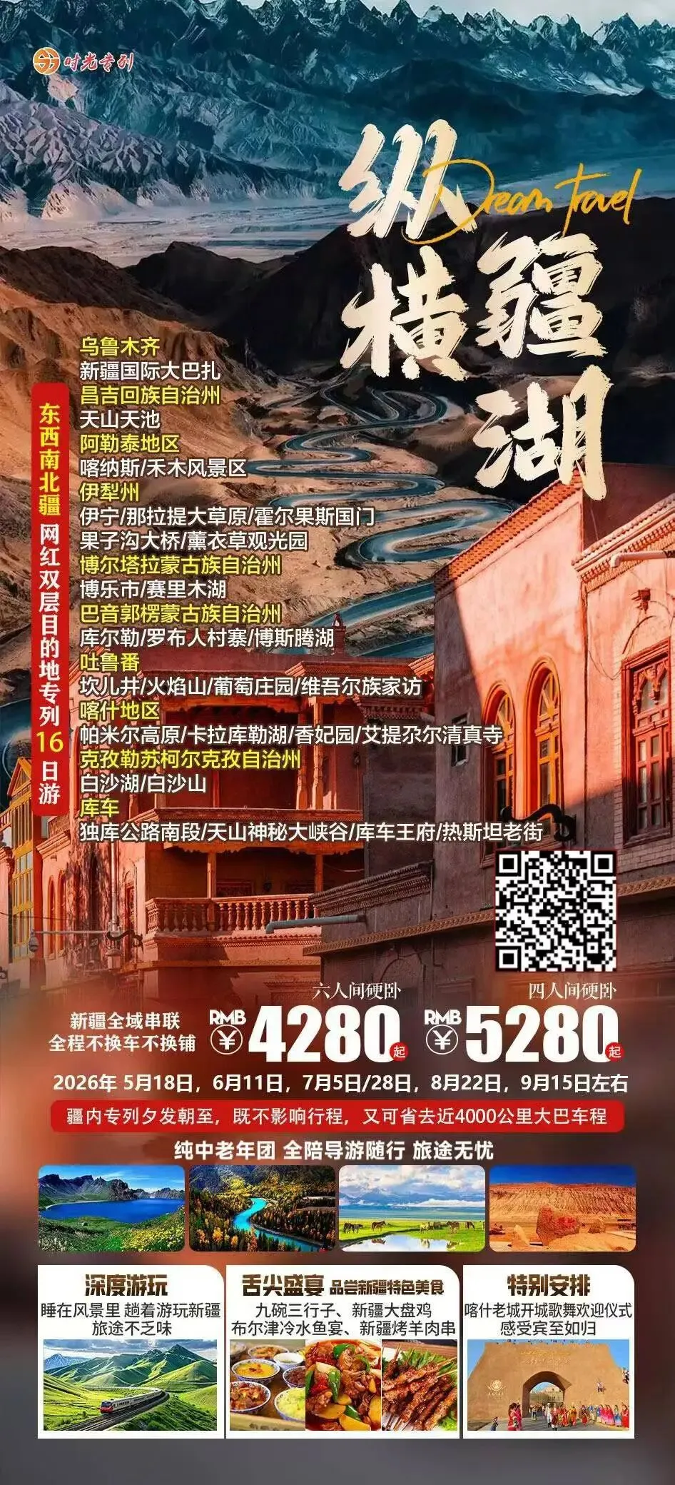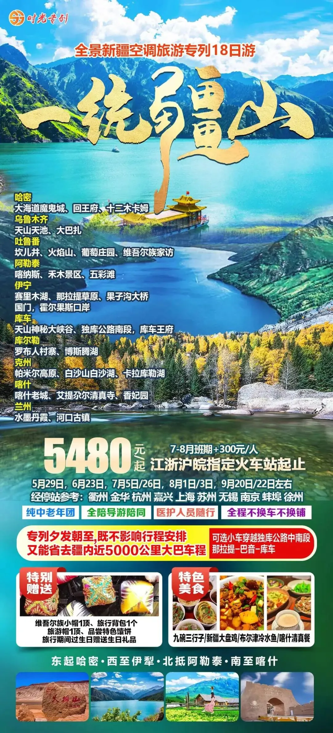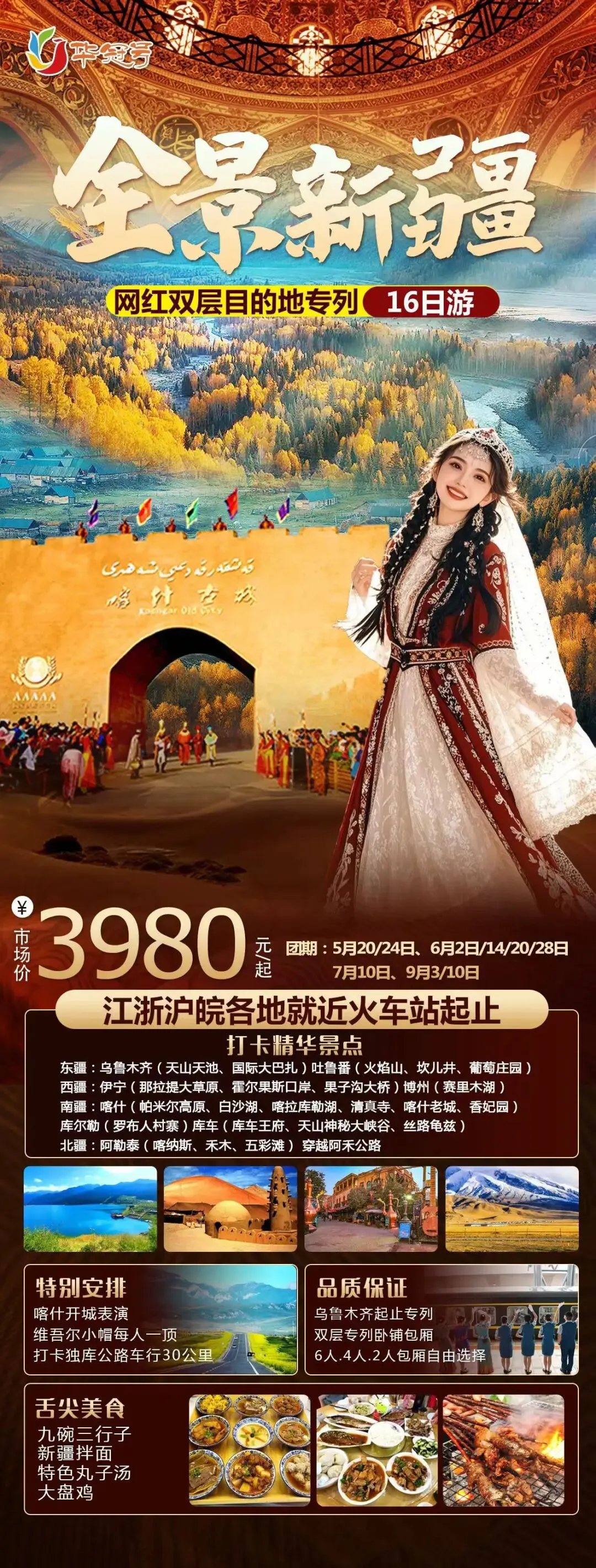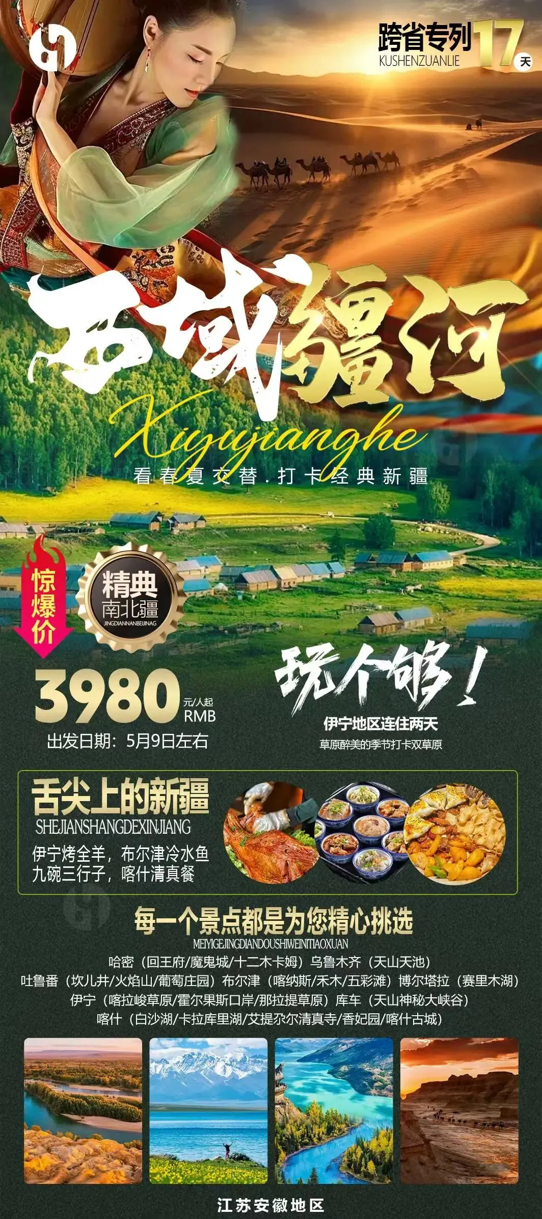 🌄 西域疆河·17天南北疆全景漫游 跨省专列·解锁新疆极致风光 ✨ 行程亮点 17天深度环游:一次走遍南北疆精华,从沙漠到草原,从雪山到湖泊 伊宁连住2晚:恰逢草原醉美季节,深度打卡双草原,慢享伊犁风光 舌尖盛宴:伊宁烤全羊、布尔津冷水鱼、九碗三行子、喀什清真餐,尝遍地道新疆味 经典景点全覆盖:天山天池、喀纳斯、赛里木湖、那拉提、喀什古城等,每一处都是视觉盛宴 💰 惊爆价:3980元/人起 📅 出发日期:5月9日左右(江苏安徽地区专享) 📸 打卡清单 东疆:哈密回王府/魔鬼城/十二木卡姆,吐鲁番坎儿井/火焰山/葡萄庄园 北疆:乌鲁木齐天山天池,布尔津喀纳斯/禾木/五彩滩,博尔塔拉赛里木湖 伊犁:喀拉峻草原/霍尔果斯口岸/那拉提草原 南疆:库车天山神秘大峡谷,喀什白沙湖/卡拉库里湖/艾提尕尔清真寺/香妃园/喀什古城 |