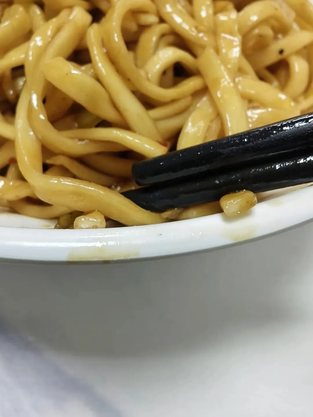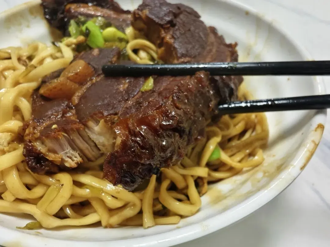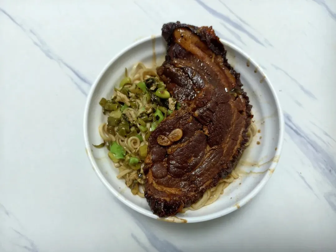 又不知道多久没吃大肉面了啊~~先回顾一下之前写过的几家: 大肉面总体的东西之前第一篇就写过了不再赘述了,每年总是有那么一阵子想吃,但是只要吃过那么一两次,就完全不想再吃了,其实南京本地人也都是吃小煮面比较多,我怀疑,南京大部分大肉面,尤其是热门的那几家,都是靠外地游客才能挣钱。 许家大肉面,原本叫“许家馄饨面”,看名字也知道,本业其实是馄饨面条双修,但是乘着这股大肉面的东风,迁址以后顺便把名字也给改成“许家大肉面”了,这波改名很成功,加上大肉做得也确实有点东西,慢慢人气也旺起来了。 新店店面还是比较干净整洁的,大肉面一碗是26元,在南京也属于正常水平,大部分比较热门的大肉面现在也都是25-27元上下。 点了干拌,这一端上上来视觉冲击力还是拉满了…大肉比碗大,轻轻松松过桥了,厚度也够,给的部位也是我比较喜欢的,是偏瘦一些、带脆骨的下五花,尽管只点了大肉面,但里面也加了些许小菜。 大肉面的重头戏就是肉了,一般来说经过先炸再卤的工序,肥肉部分不需太过担心,不太会腻,但瘦肉部分就怕柴了,不好吃,但他家的大肉火候掌握得就非常到位,肥肉不腻,瘦肉部分也不算柴,不像某龙,柴到塞牙。 肉皮炸出了标准的虎皮,那层虎皮薄薄一层甚至可以从肉上脱落下来。但是吧,又要说但是了,大肉的卤制的口感稍微欠缺了点香味,卤料应该还是欠缺了些,不过整体还是不错的,不像某龙,咸味把香味完全盖过了。 干拌面的底油也很重要,他家的底料肯定也是猪油、酱油,还很有特色地加了蒜蓉,这是我吃过的第二家加蒜蓉的干拌面,第一家不在上面写过的那几家里,我觉得那家也相当好吃,而且还没火,有机会再去一次。 除了蒜蓉,他家还有一个特色是加了些许辣椒,使整个底料多了一丝丝辣味,不过口感上的提升并不大。 此外,糖和味精用得很克制,在南京绝对不算重甜口的,吃完也不会觉得舌尖发麻,总之这个底料还不错,有创新但口味上中规中矩,个人觉得再加点糖会更好。 面条其实他们家一大特色,不像南京大部分面条店用的那种细碱面,他们用的是手擀面,煮的也很呛,里面面芯还是白的,这个手擀面有点像之前去吃过的面条|南京 程家神面正宗手擀小刀面。