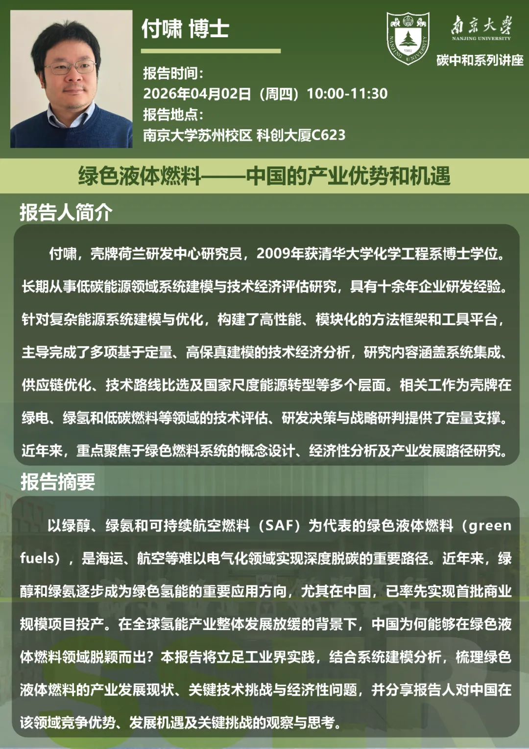 以绿醇、绿氨和可持续航空燃料(SAF)为代表的绿色液体燃料(green fuels),是海运、航空等难以电气化领域实现深度脱碳的重要路径。近年来,绿醇和绿氨逐步成为绿色氢能的重要应用方向,尤其在中国,已率先实现首批商业规模项目投产。在全球氢能产业整体发展放缓的背景下,中国为何能够在绿色液体燃料领域脱颖而出?本报告将立足工业界实践,结合系统建模分析,梳理绿色液体燃料的产业发展现状、关键技术挑战与经济性问题,并分享报告人对中国在该领域竞争优势、发展机遇及关键挑战的观察与思考。