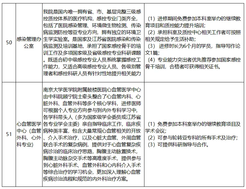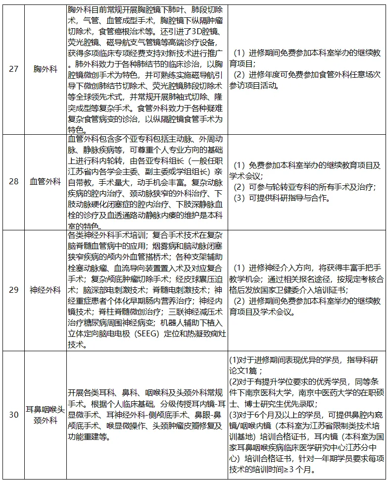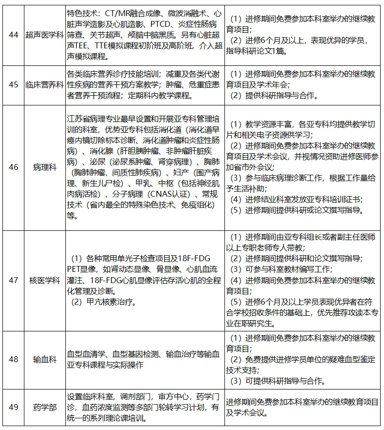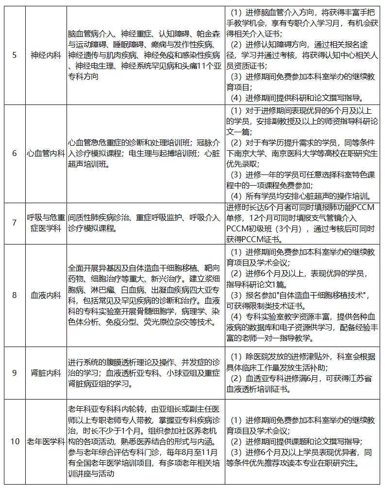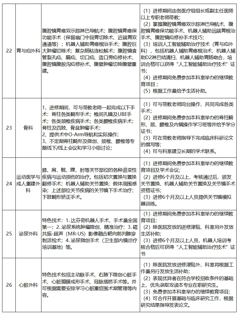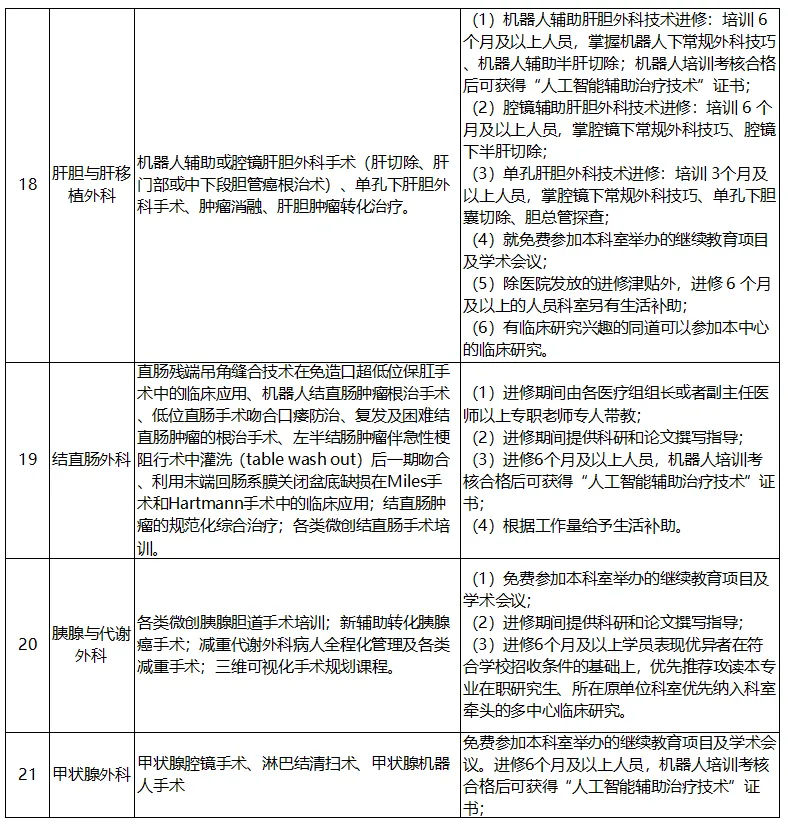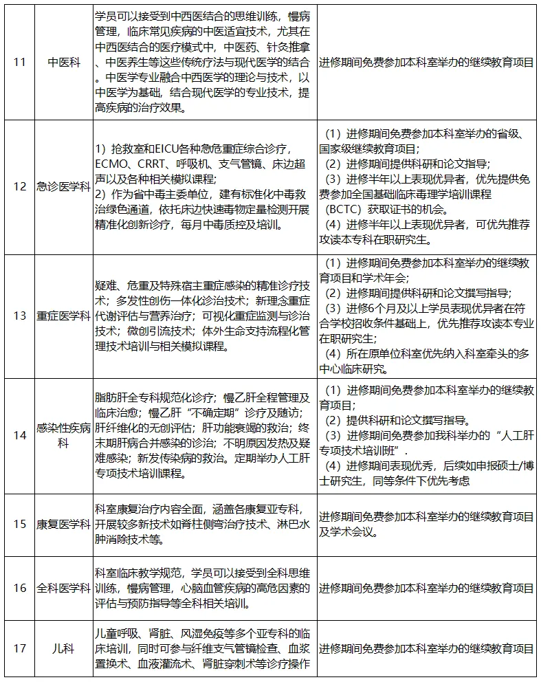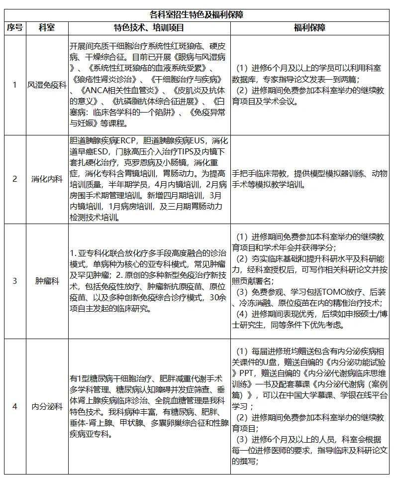 进修时长为6个月及以上的人员享受医院发放的进修津贴(医联体单位人员按照医院相关规定执行),同时可报名参加教育处举办的师资培训,可获我院师资培训证书。各科室招生特色技术、培训项目及福利保障详见下表:
