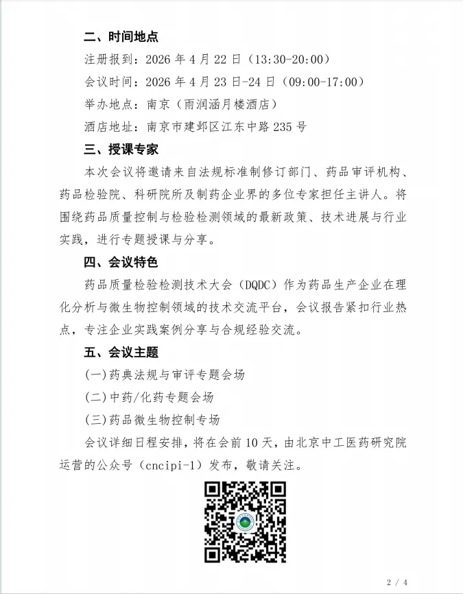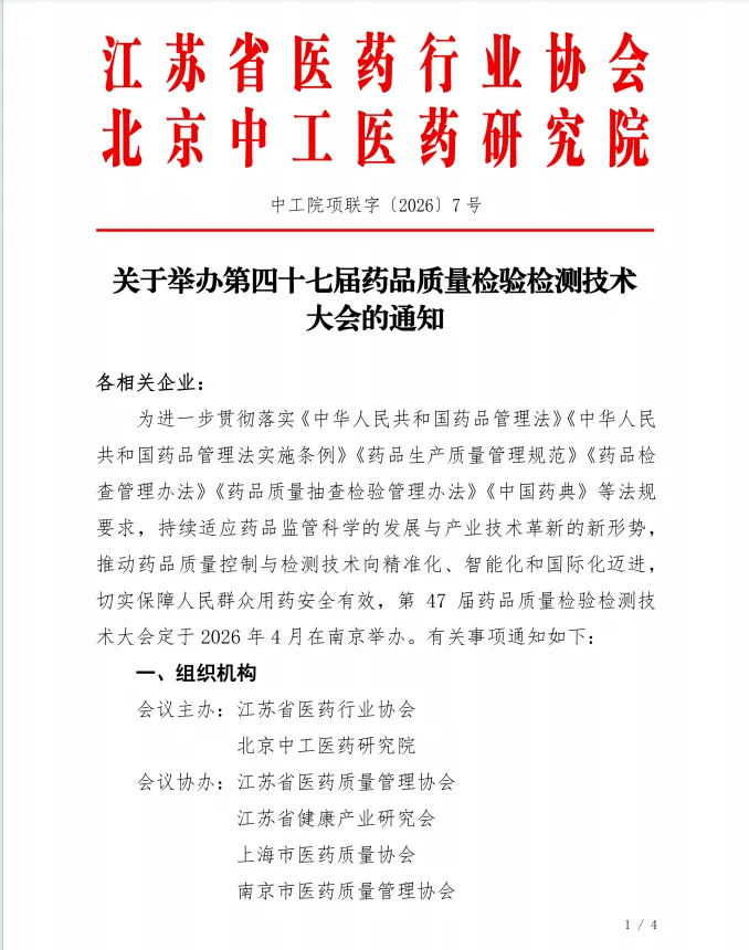 为进一步贯彻落实《中华人民共和国药品管理法》《中华人民共和国药品管理法实施条例》《药品生产质量管理规范》《药品检查管理办法》《药品质量抽查检验管理办法》《中国药典》等法规要求,持续适应药品监管科学的发展与产业技术革新的新形势,推动药品质量控制与检测技术向精准化、智能化和国际化迈进,切实保障人民群众用药安全有效,第47届药品质量检验检测技术大会定于2026年4月在南京举办。