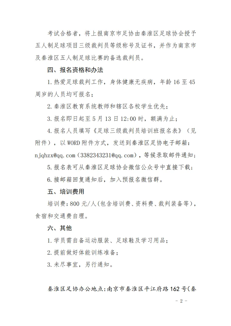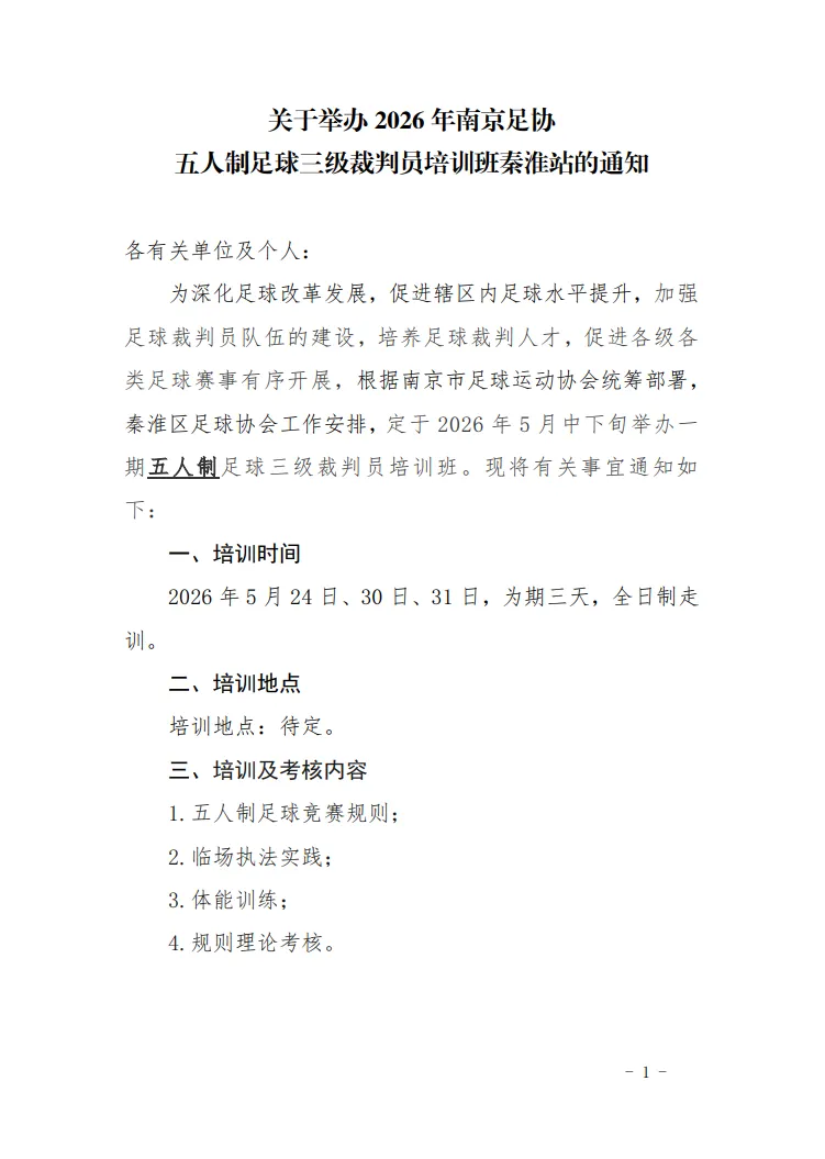>关于举办2026年南京足协五人制足球三级裁判员培训班秦淮站的通知