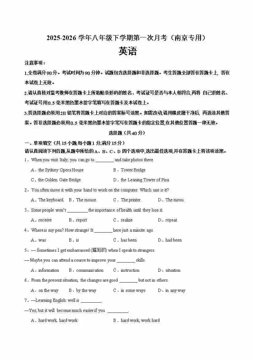 【译林】八年级英语下学期第一次月考(南京卷)(原卷版)