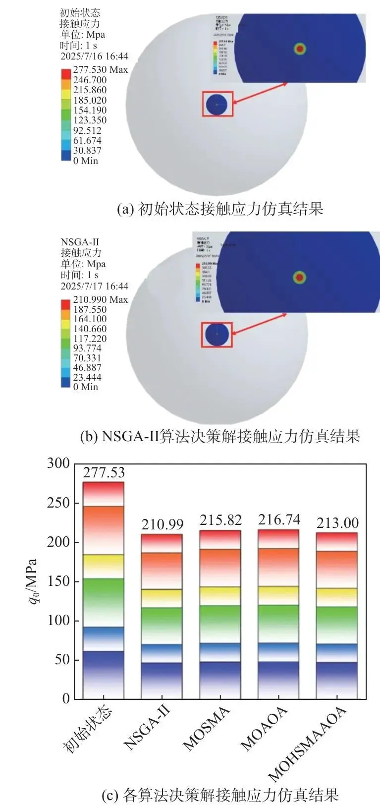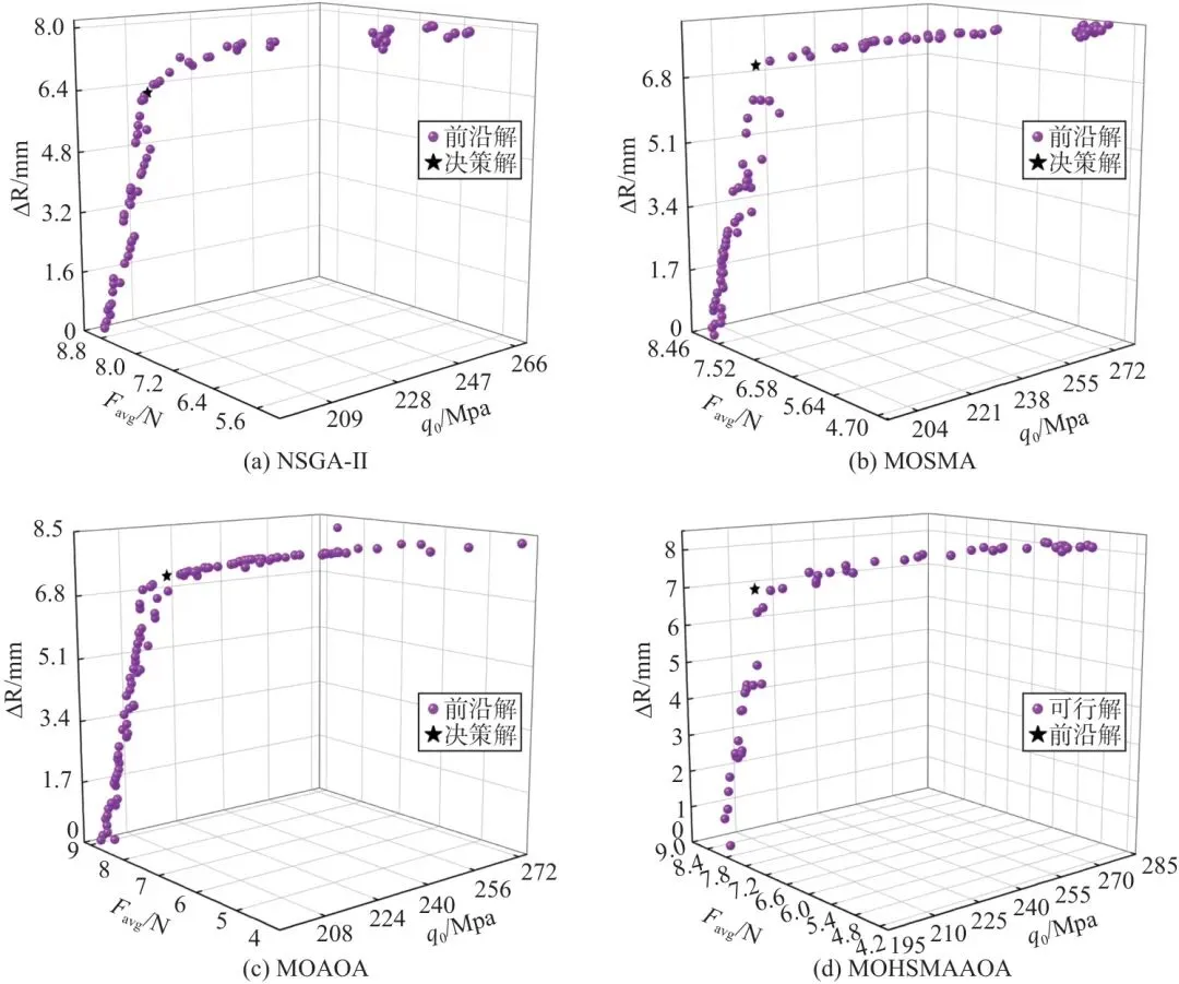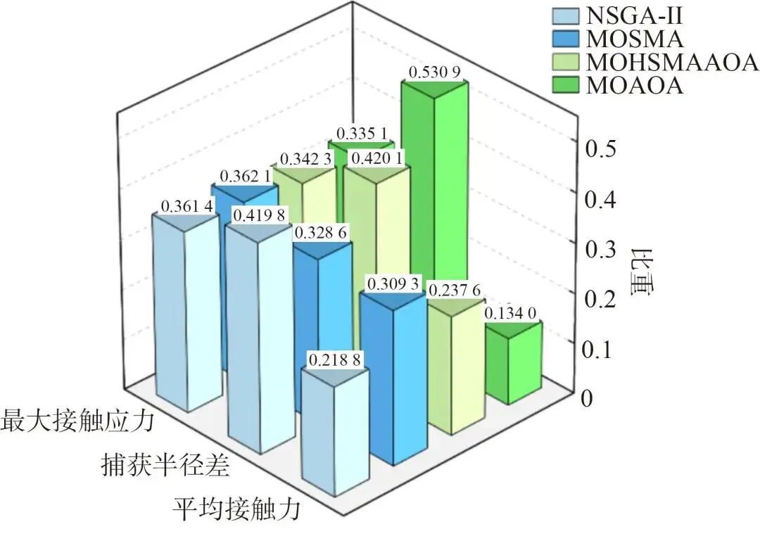 建立了以“最小化最大接触应力、最大化平均切向接触力、最大化捕获半径”为核心的优化目标体系,实现了对锁定杆与接纳锥接触界面的多目标协同优化。在此基础上,引入熵权TOPSIS方法对算法所得的Pareto最优解集进行综合评估与决策,从而在多个冲突目标间取得最佳平衡,获得了兼顾力学性能与容差能力的梯度锥角工程设计方案。经熵权TOPSIS决策,优化后最大接触应力降低23.50%,平均接触力提升41.81%,捕获半径差增大95.92%。