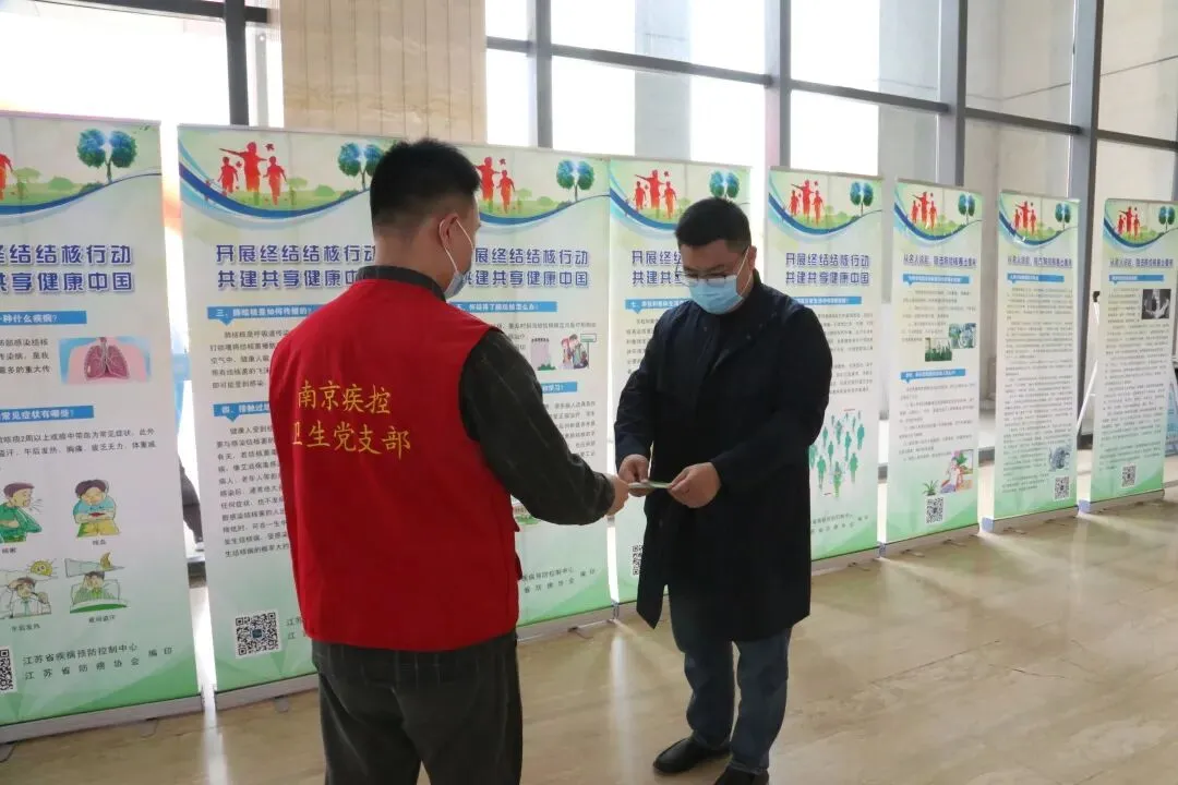 省、市、江北新区在南京工业大学江浦校区联合举办的“3.24世界防治结核病日”主题宣传活动也有卫生支部志愿者们的身影、为参与活动的南京市各大高校学生发放防治结核病宣传手册,并通过展板的形式讲解结核病防治知识,提高了宣传的针对性和有效性。助力此次防治结核病日活动。