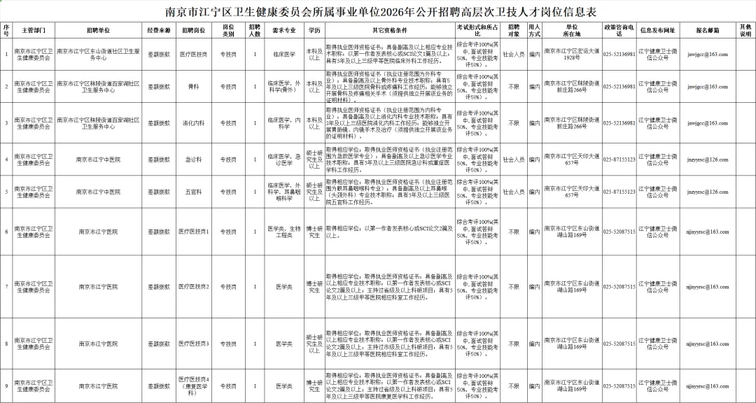 南京市江宁区卫生健康委员会所属事业单位2026年公开招聘高层次卫技人才公告