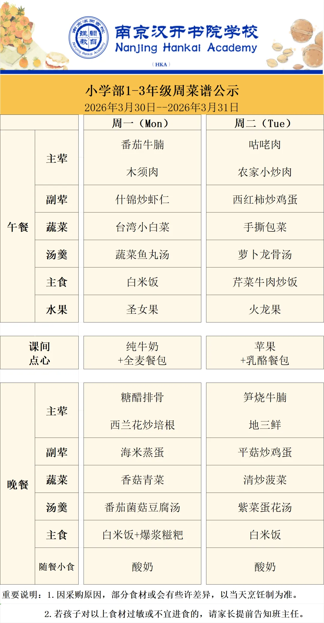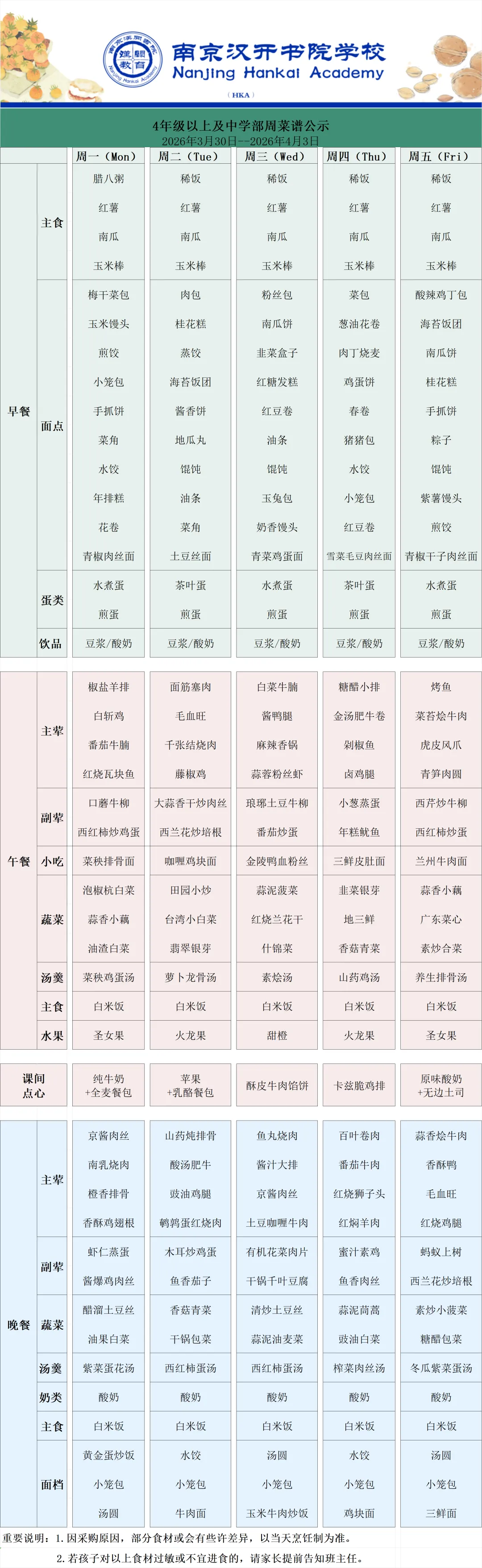 >【Hi,开开!】南京汉开周菜谱(3.30-4.3)