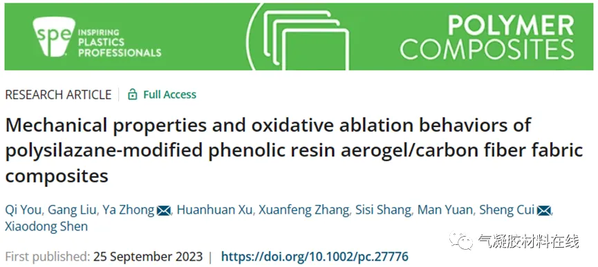 polysilazane-modified phenolic resin aerogel/carbon fiber fabric composites”为题发表在Polymer Composites期刊上。http://doi.org/10.1002/pc.27776