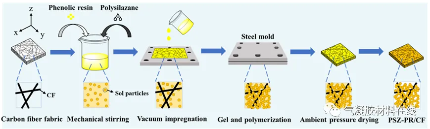 采用溶胶-凝胶法,以聚硅氮烷作为改性剂,六亚甲基四胺为交联剂,经过真空浸渍,凝胶老化和常压干燥获得PSZ-PR/CF复合材料。
