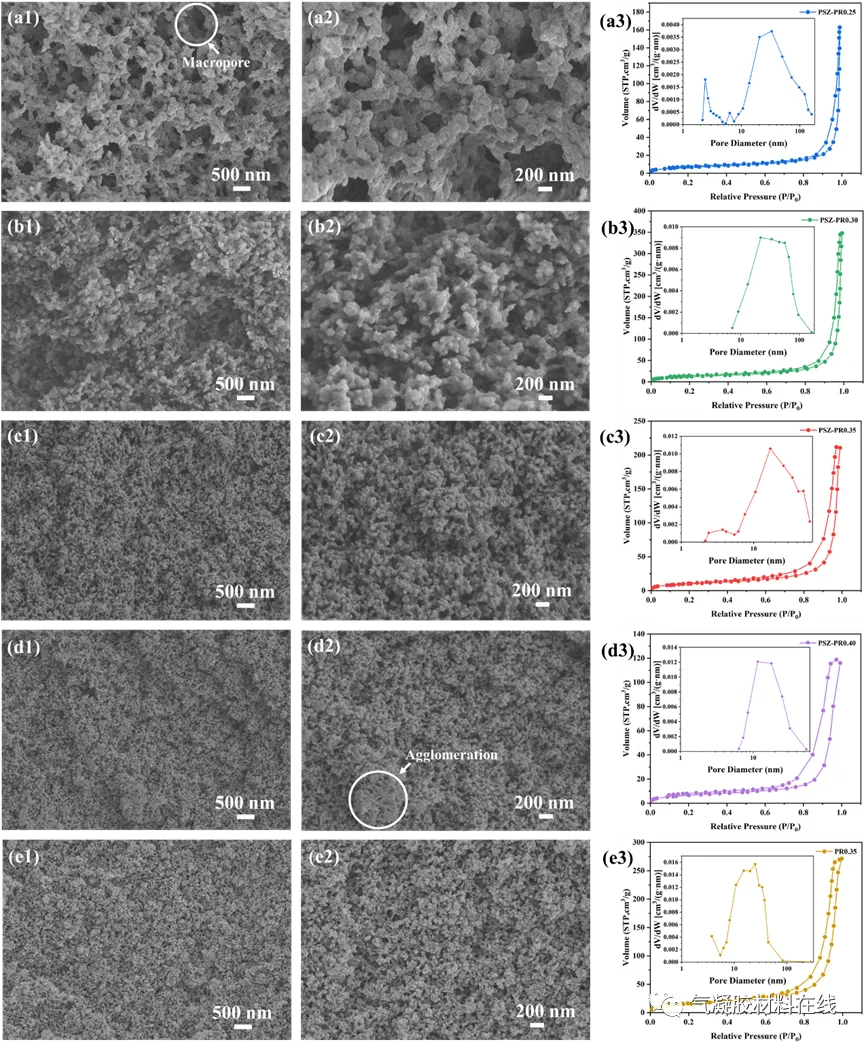 图2. (a1-e2)不同配比的PSZ-PR/CF气凝胶的SEM图像,(a3-e3)氮气吸附-脱附曲线PSZ-PR气凝胶具有连续的三维多孔网络结构,纳米孔的存在能够有效的抑制气相传热。所有PSZ-PR气凝胶样品均显示IV型等温线和H3型滞回线,这表明所制备的气凝胶具有中孔和大孔。