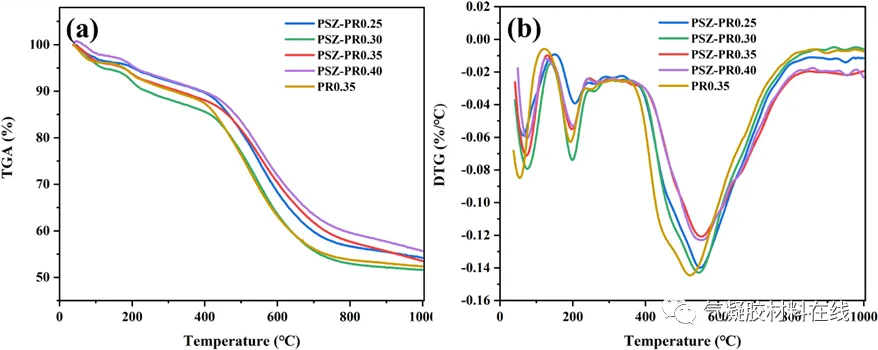 图3. PSZ-PR和PR气凝胶的(a)TG和(b)DTG曲线PSZ-PR气凝胶和PR气凝胶的热降解行为与酚醛树脂相似,表现为25-400 ℃、400-800 ℃、800-1000 ℃三个阶段。接枝到PR分子上的PSZ可以有效抑制PR的降解,使得PSZ-PR0.35的最大热降解速率温度提高了32.1 ℃,热稳定性得到了改善。