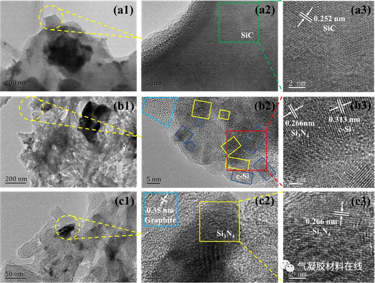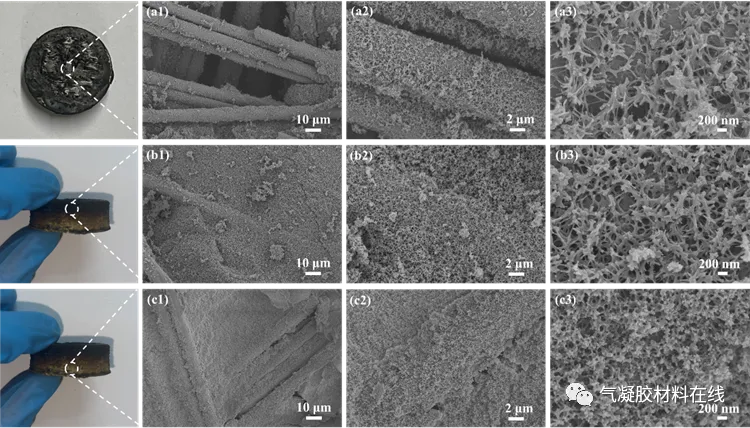 图5. 烧蚀过后PSZ-PR/CF复合材料的SEM图像(a1-a3)烧蚀层 (b1-b3)碳化层 (c1-c3)原始层