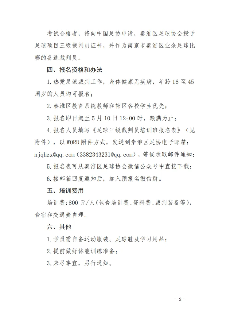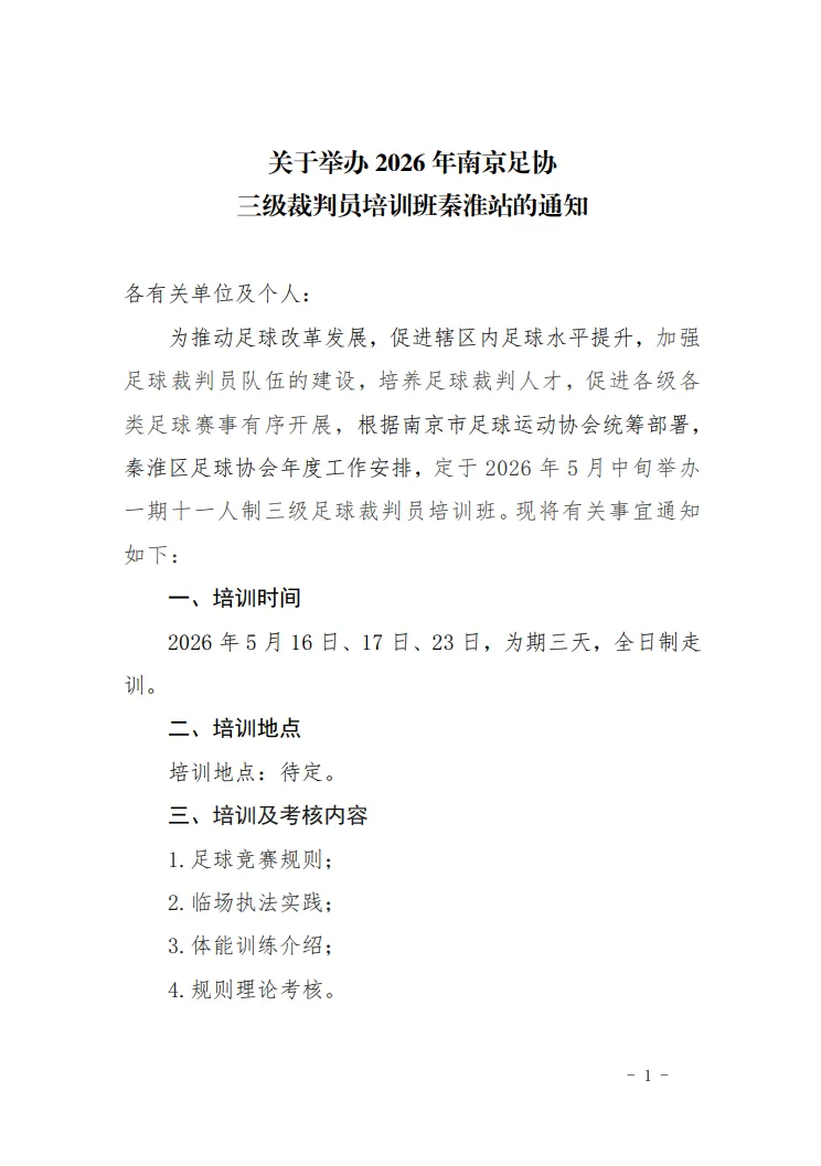 >关于举办2026年南京足协足球三级裁判员培训班秦淮站的通知