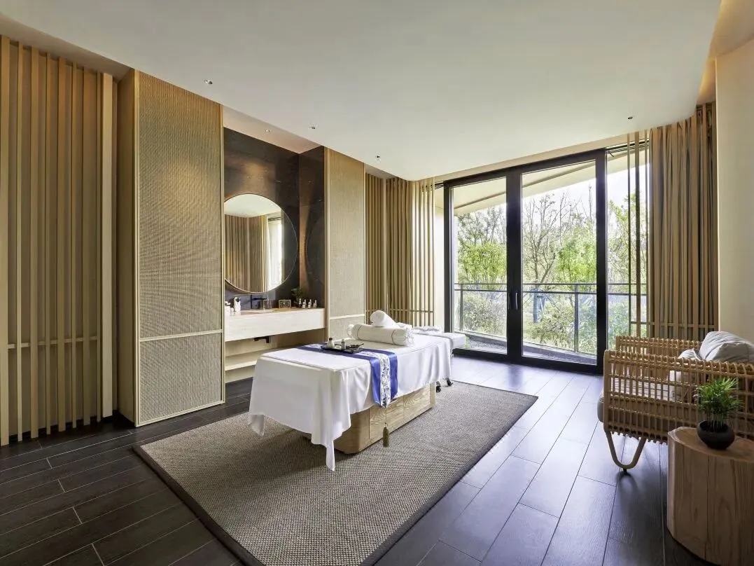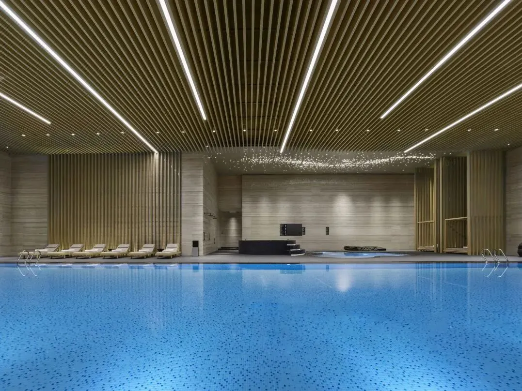 曼殊大堂吧,4000㎡的通透空间自空中而下错落布置着景观绿植,漂浮式天花恰似片片树荫,仿若置于自然山林间,周身环绕湖光山色的幽谧庭院,品尝特色茶点的同时,亦可沉浸感受以自然元素为设计载体的艺术氛围。24小时开放的健身中心配备了必确(Precor)品牌高端运动器材;水疗中心、室内恒温游泳池、可供冥想的静谧空间,在牛首山东麓之下为酒店控打造了一方亦动亦静的空间。