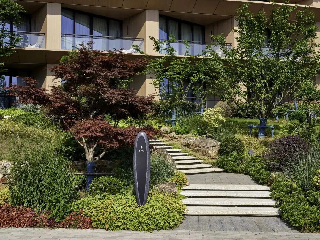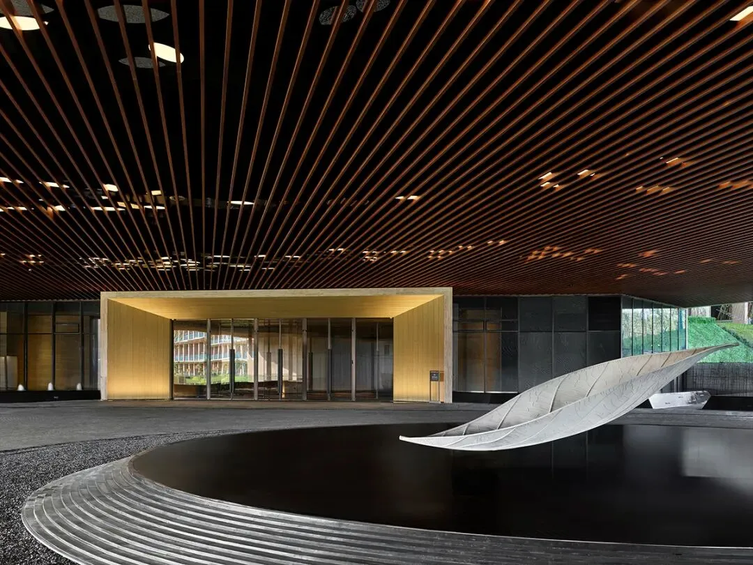 楼体造型独特呈X形,将绿植景观、人文理念与空间巧妙相糅合。整体空间采用的大幅落地窗将自然景观引入室内,氛围格调则牛首山和谐辉映,营造出一处静谧喜悦的半山幽境。酒店园林中,绿植种类覆盖已超百种,从酒店入口的车行通道开始便被植物景观所围绕,落客步行即可看到南京自然山林中常见的多年生地被与土石的造景,感受真实的原始山林风貌。步入酒店的接待大堂,通透的空间错落布置着景观绿植,落地窗借景入室,漂浮式天花恰似片片树荫,周身被湖光山色所环绕的幽谧庭院,仿佛正感受一场由自然演绎的交响曲。03.
