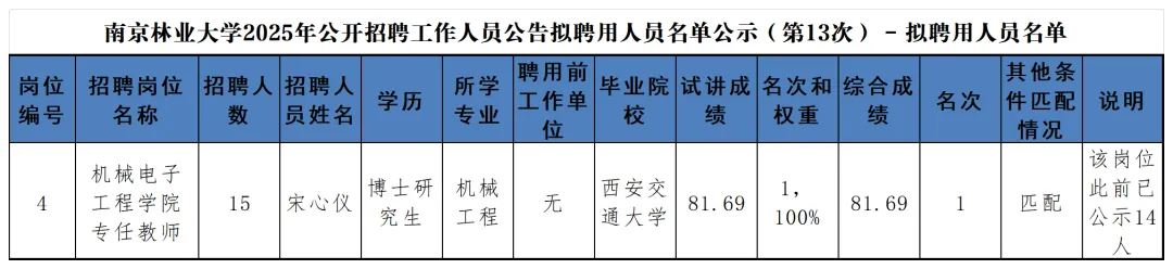 南京林业大学2025年公开招聘工作人员公告拟聘用人员名单公示(第13次)