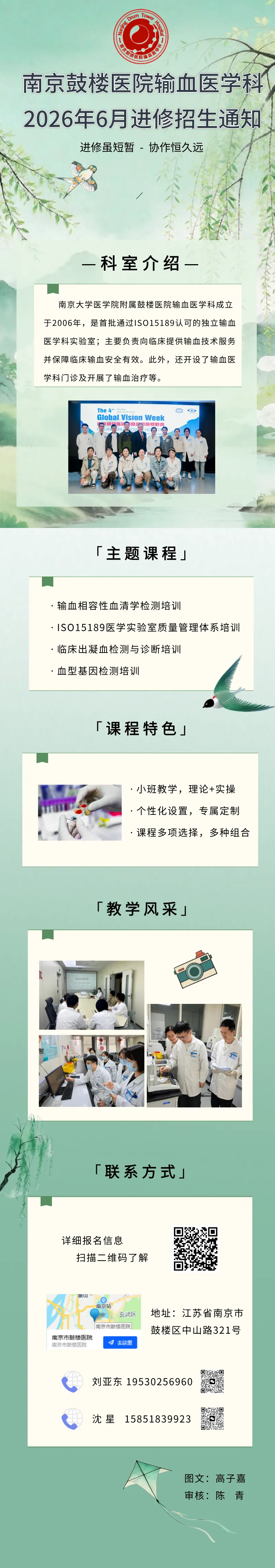 >南京鼓楼医院输血医学科2026年6月进修招生开始了!