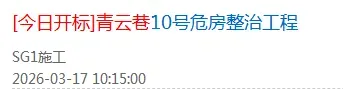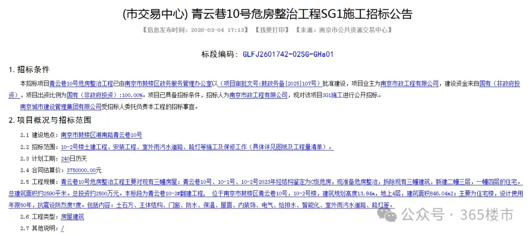 根据官方招标公告,青云巷10号危房整治工程今天正式开标。这个建于1958年、鉴定为C级的危房,即将通过“原拆原建”重获新生。