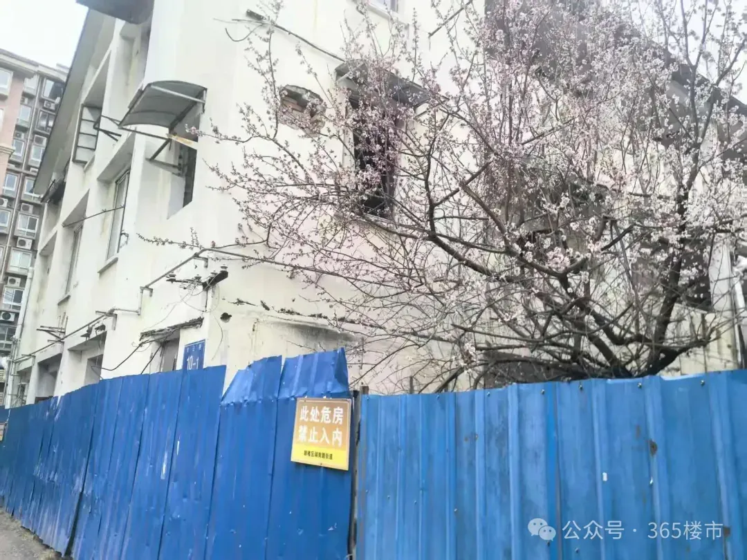 楼栋已经被蓝色的铁皮围挡严严实实地围了起来,围挡上醒目地挂着“危房拆除,请勿靠近”的警示牌。