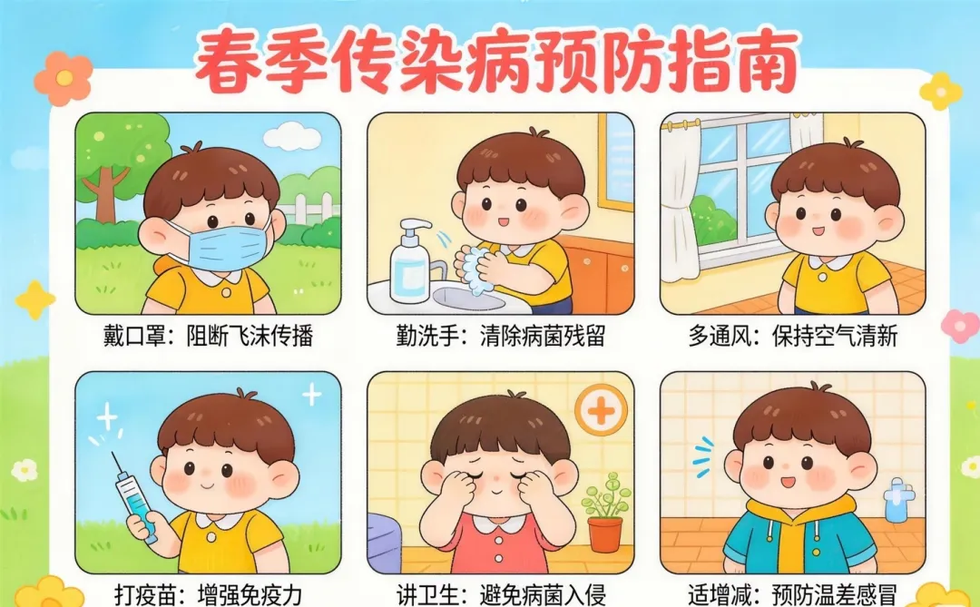 1.春日是流感、水痘、诺如病毒感染性腹泻等传染病高发期,提醒孩子做好个人防护,勤洗手、常通风,保持良好卫生习惯;打喷嚏、咳嗽时用纸巾或手肘遮掩口鼻,不随地吐痰。