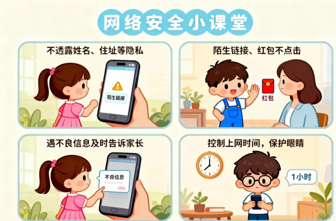 2.教育孩子不点击陌生链接,不轻信陌生来电和网络信息,不泄露个人姓名、住址、学校、家长联系方式等隐私信息,警惕网络诈骗、网络游戏充值诈骗等行为。